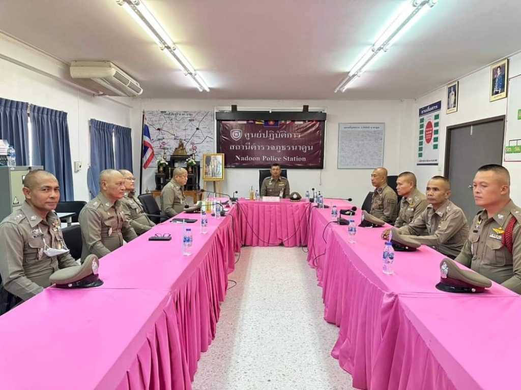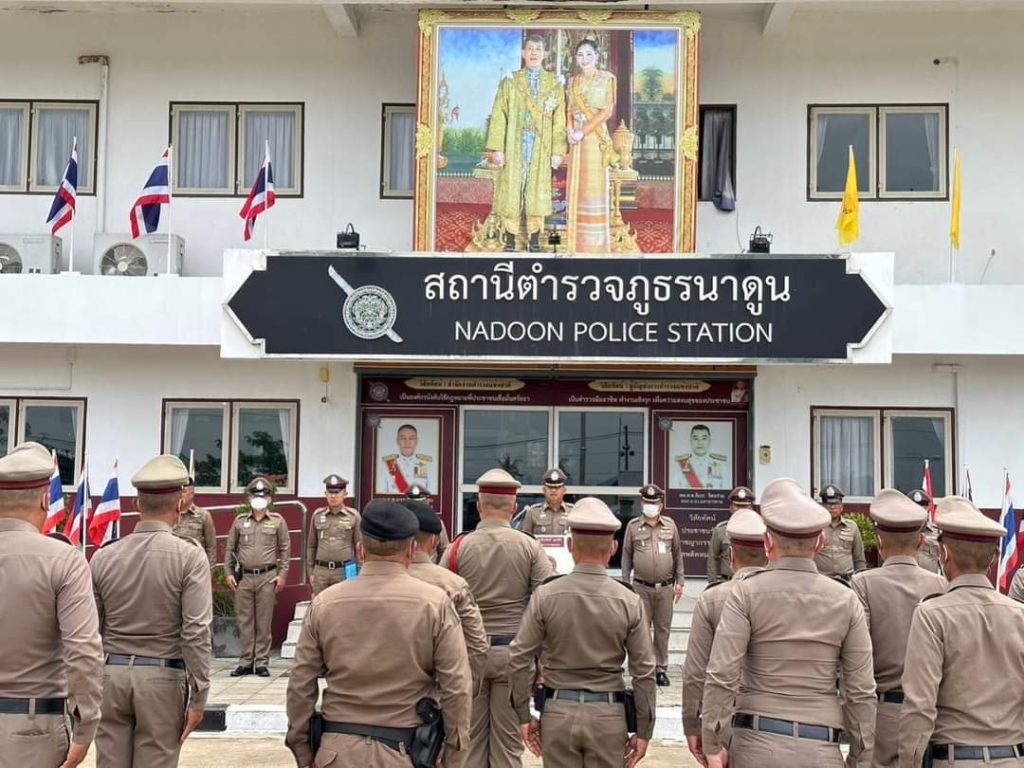 พร้อมด้วยข้าราชการตำรวจ สภ.นาดูน ให้การต้อนรับ จากนั้นได้ดำเนินการตรวจราชการ พร้อมทั้ง ได้กำชับให้ข้าราชการตำรวจทุกนาย ปฏิบัติหน้าที่ตามที่ตนเองได้รับมอบหมายให้เป็นอย่างดี ห้ามยุ่งเกี่ยวกับยาเสพติด และปฏิบัติตามนโยบายและข้อสั่งการของผู้บังคับบัญชาโดยเคร่งครัด