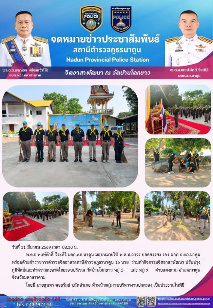 สภ.นาดูน วันที่ 31 มี.ค.2569 แต่เวลา 08.30 น. พ.ต.อ.พงษ์ศักดิ์ วีระศิริ ผกก.สภ.นาดูน มอบหมายให้ พ.ต.ท.ถาวร ยอดยรรยง รอง ผกก.ป.ฯ พร้อมด้วยข้าราชการตำรวจจิตอาสา สภ.นาดูน จำนวน 15 นาย ร่วมกับจิตอาสาข้าราชการอื่น 35 คน และประชาชนจิตอาสา จำนวน 150 คน ร่วมทำกิจกรรมจิตอาสาพัฒนา ปรับปรุงภูมิทัศน์และทำความสะอาดโดยรอบ วัดบ้านโคกยาว ม.5,9 ต.ดงดวน อ.นาดูน จ.มหาสารคาม