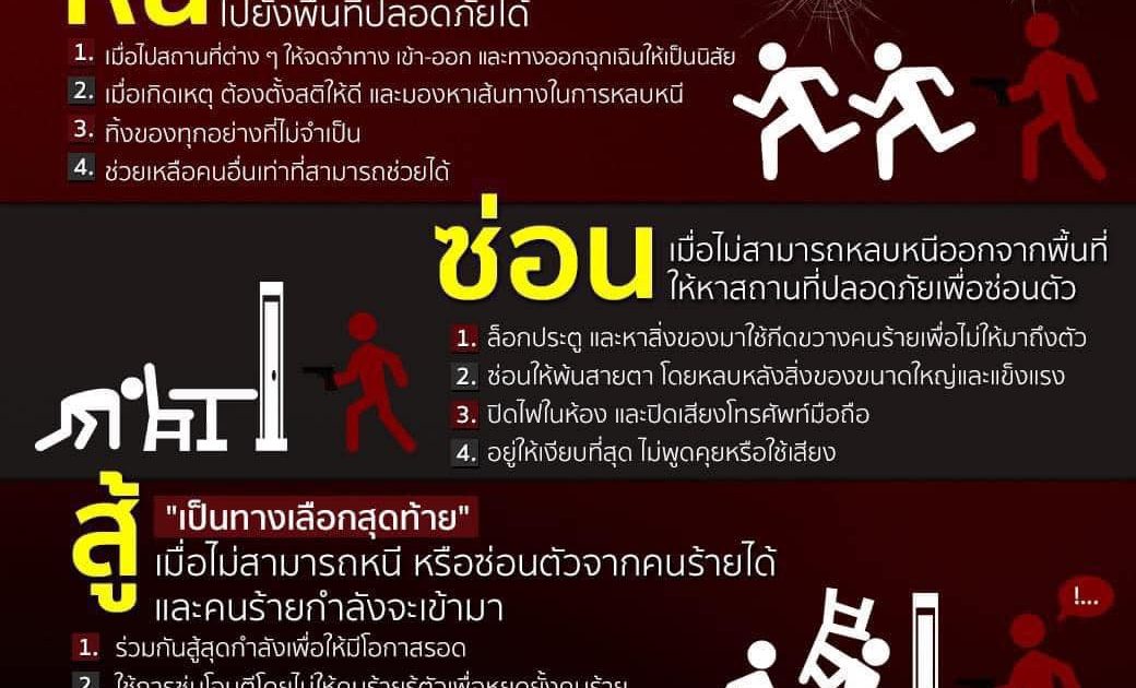 ทั้งนี้ขอให้ประชาชน ระมัดระวังอย่าตื่นตระหนกและปฏิบัติตามคำแนะนำ #หนีซ่อนสู้ เมื่อเจอเหตุคนคลุ้มคลั่ง