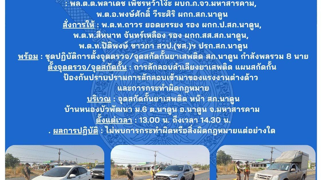 ว.1 : จุดสกัดบริเวณหน้า สภ.นาดูน บ้านหนองบัวพัฒนา ม.6 ต.นาดูน อ.นาดูน จ.มหาสารคาม