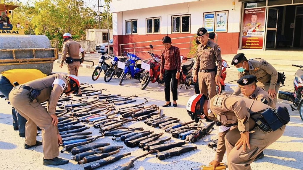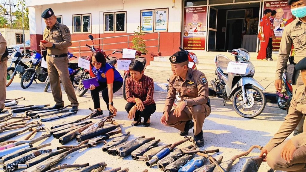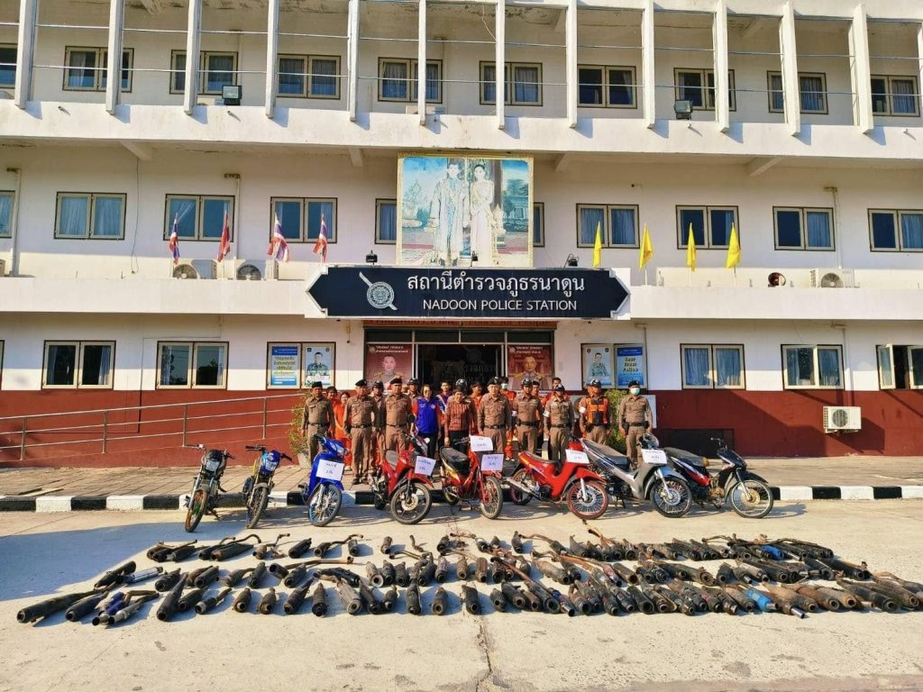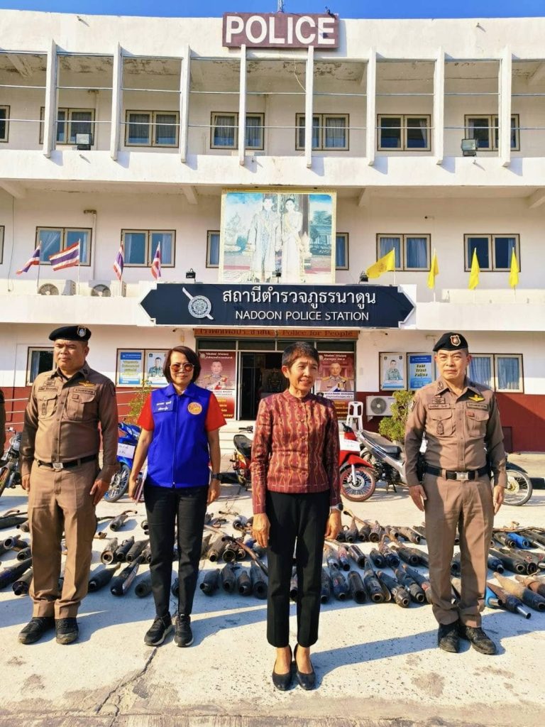 พ.ต.อ.พงษ์ศักดิ์ วีระศิริ ผกก.สภ.นาดูน พร้อมด้วย พ.ต.ท.ศักดิ์สิทธิ์ ศิริประภานนท์กุล รอง ผกก.(สอบสวน) สภ.นาดูน, นางอรวรรณ นุตะดี ปลัดอาวุโส, กต.ตร.สภ.นาดูน และภาคีเครือข่าย ร่วมเป็นสักขีพยาน ในการนำรถจักรยานยนต์และท่อไอเสียที่ไม่ได้มาตรฐาน มอก.กำหนด ซึ่งตรวจยึดตามมาตรการป้องกัน ปรามปรามการแข่งรถในทาง รถเสียงดังก่อให้เกิดความเดือดร้อนรำคาญในพื้นที่ สภ.นาดูน สภ.วาปีปทุม สภ.นาเชือก สภ.ยางสีสุราช สภ.กำพี้ จำนวน 120 รายการ มาทำลายไม่ให้นำกลับมาใช้งานได้