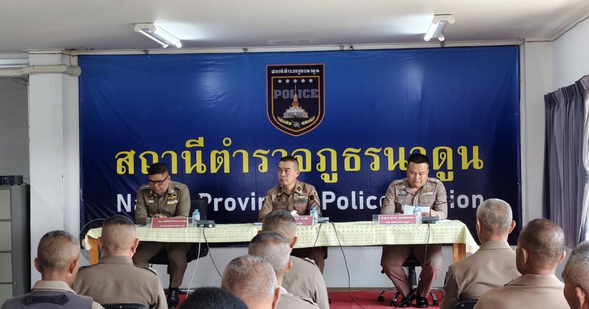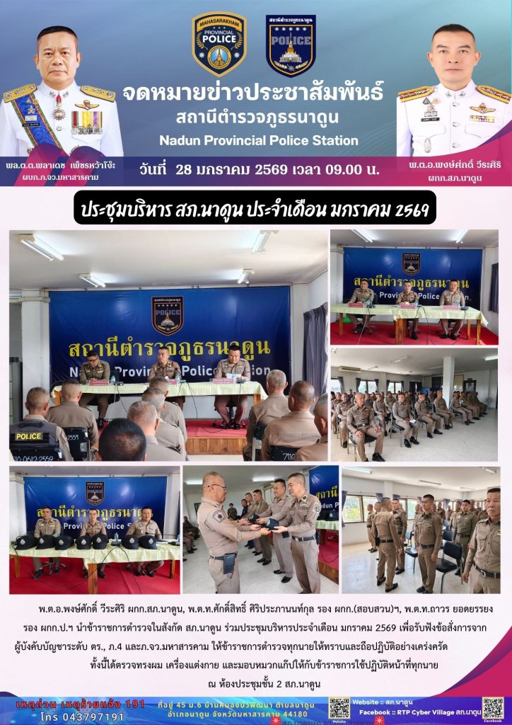 สภ.นาดูน วันนี้ (28 ม.ค.69) เวลา 09.00 น. พ.ต.อ.พงษ์ศักดิ์ วีระศิริ ผกก.สภ.นาดูน, พ.ต.ท.ศักดิ์สิทธิ์ ศิริประภานนท์กุล รอง ผกก.(สอบสวน)ฯ, พ.ต.ท.ถาวร ยอดยรรยง รอง ผกก.ป.ฯ นำข้าราชการตำรวจในสังกัด สภ.นาดูน ร่วมประชุมประจำเดือน เพื่อรับฟังข้อสั่งการจากผู้บังคับบัญชาระดับ ตร., ภ.4 และภ.จว.มหาสารคาม ให้ข้าราชการตำรวจทุกนายให้ทราบและถือปฏิบัติอย่างเคร่งครัด