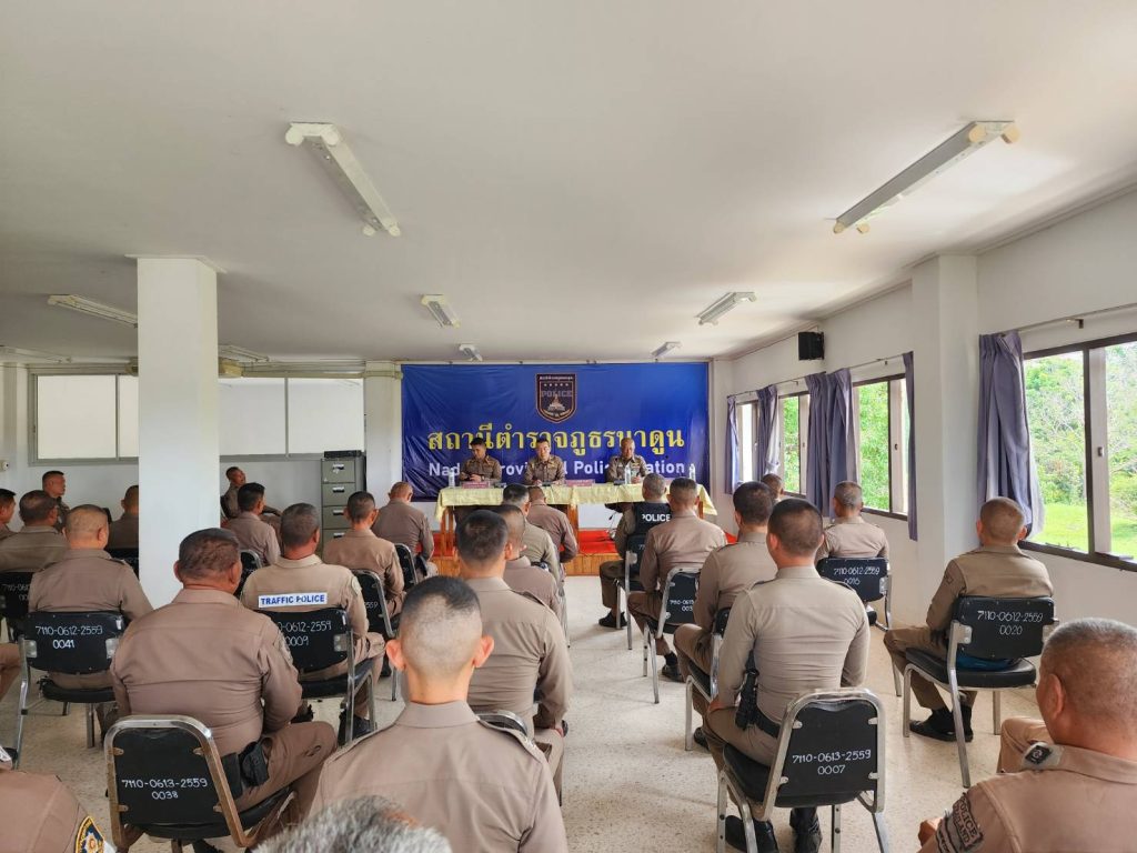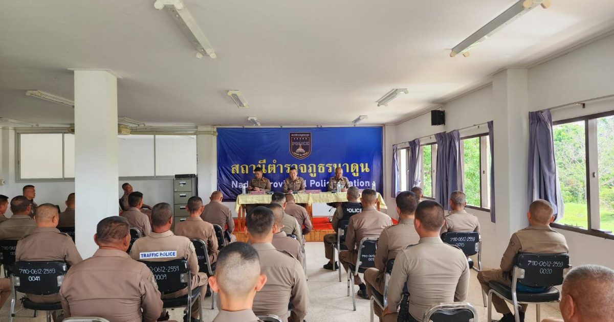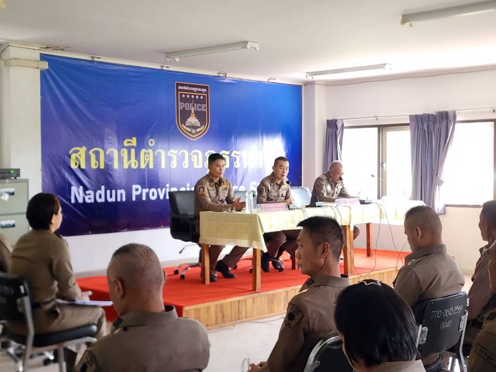 สภ.นาดูน วันนี้ (19 มิ.ย.68) เวลา 10.00 น. พ.ต.อ.พงษ์ศักดิ์ วีระศิริ ผกก.สภ.นาดูน พร้อมด้วย พ.ต.ท.กิตติพงศ์ เขียวหวาน รอง ผกก.ป.ฯ, พ.ต.ท.ปริญญา นามภักดิ์ รอง ผกก.สส.ฯ นำข้าราชการตำรวจในสังกัด สภ.นาดูน ประชุมบริหารประจำเดือน มิ.ย. 2568 เพื่อแจ้งข้อสั่งการจากผู้บังคับบัญชา ระดับ ตร., ภ.4 และ ภ.จว.มหาสารคาม ให้ข้าราชการตำรวจทุกนายรับทราบและถือปฏิบัติอย่างเคร่งครัด และประดับยศ ส.ต.อ., ส.ต.ท. ให้กับข้าราชการตำรวจผู้ที่ได้เลื่อนยศสูงขึ้น