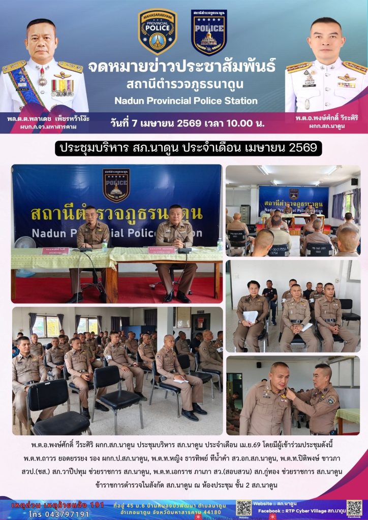 สภ.นาดูน วันนี้ (7 เม.ย.69) เวลา 10.00 น. พ.ต.อ.พงษ์ศักดิ์ วีระศิริ ผกก.สภ.นาดูน ประชุมบริหาร สภ.นาดูน ประจำเดือน เม.ย.69 โดยมีผู้เข้าร่วมประชุมดังนี้