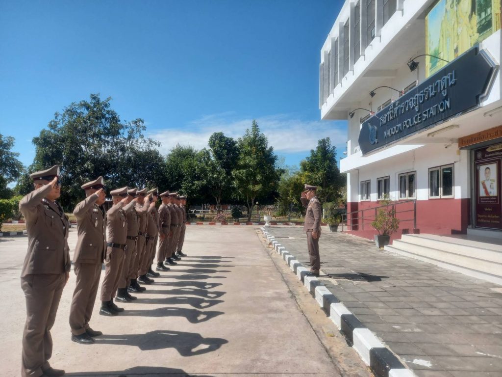 วันที่ 18 ธันวาคม 2566 พ.ต.อ.พงษ์ศักดิ์ วีระศิริ ผกก.สภ.นาดูน พร้อมด้วย พ.ต.ท.ปริญญา นามภักดิ์ รอง ผกก.สส.ฯ, พ.ต.ท.ณัฐวัฒน์ เจือมา สว.สส.ฯ หัวชุดเคลื่อนที่เร็ว สภ.นาดูน ปล่อยแถว ตรวจเช็คจำนวน ตรวจเครื่องแต่งกาย และให้เตรียมความพร้อม ณ ที่ตั้ง หากมีคำสั่งให้ ปฏิบัติหน้าที่ ณ หน้า สภ.นาดูน