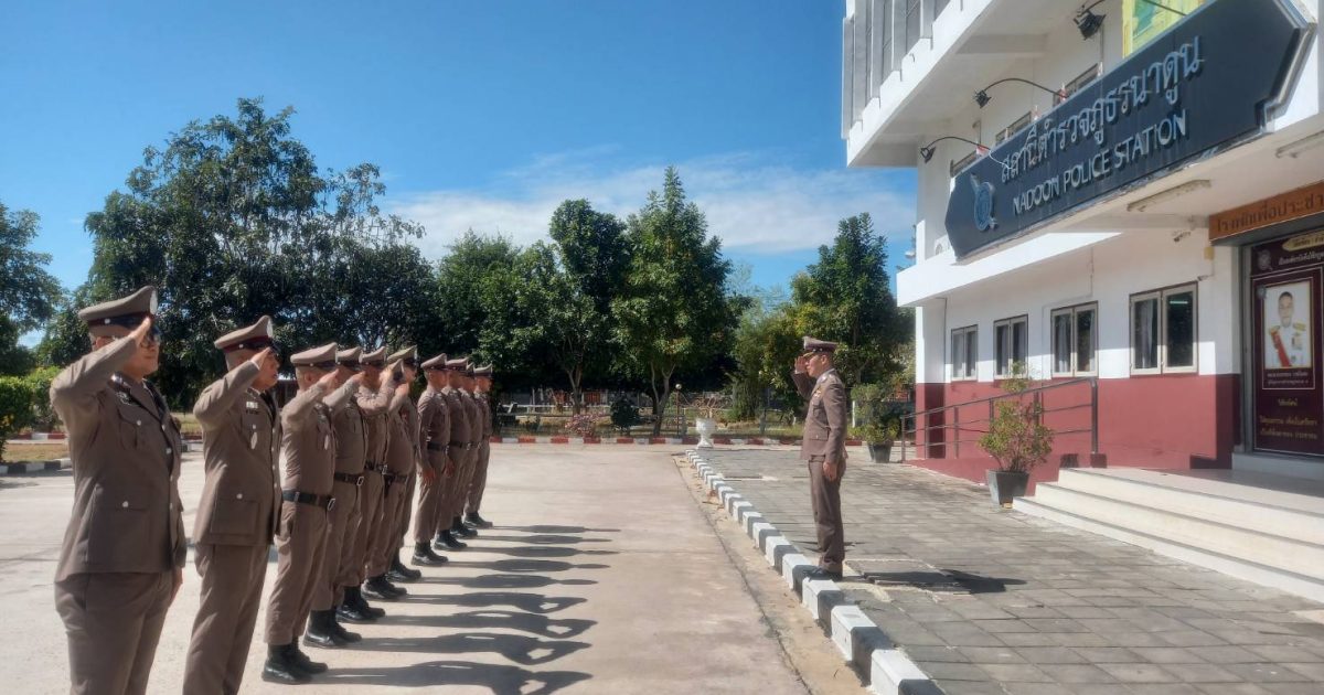 วันที่ 18 ธันวาคม 2566 พ.ต.อ.พงษ์ศักดิ์ วีระศิริ ผกก.สภ.นาดูน พร้อมด้วย พ.ต.ท.ปริญญา นามภักดิ์ รอง ผกก.สส.ฯ, พ.ต.ท.ณัฐวัฒน์ เจือมา สว.สส.ฯ หัวชุดเคลื่อนที่เร็ว สภ.นาดูน ปล่อยแถว ตรวจเช็คจำนวน ตรวจเครื่องแต่งกาย และให้เตรียมความพร้อม ณ ที่ตั้ง หากมีคำสั่งให้ ปฏิบัติหน้าที่ ณ หน้า สภ.นาดูน