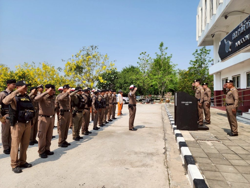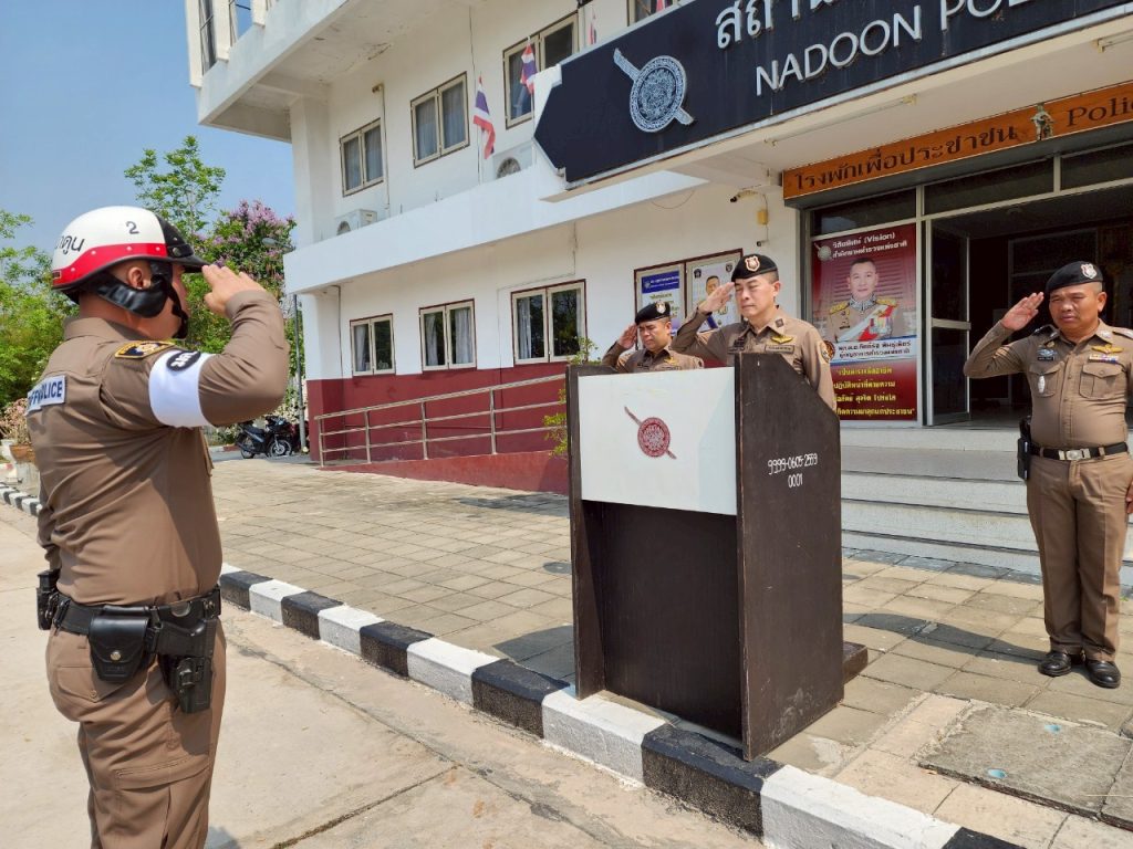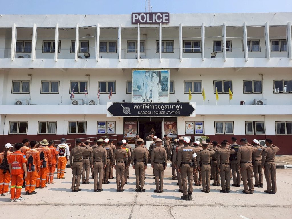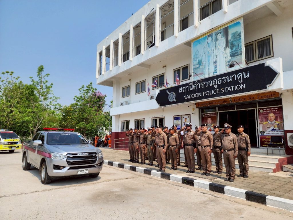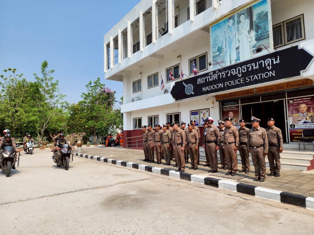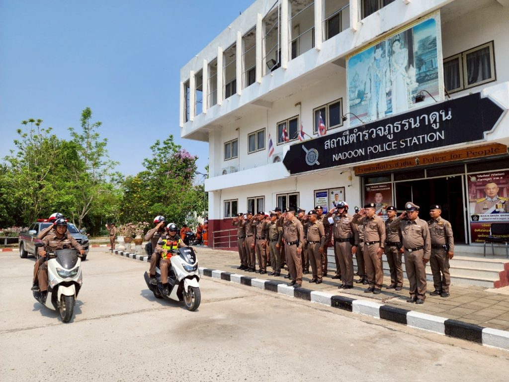 สภ.นาดูน วันนี้ ( 9 เม.ย.68 ) เวลา 11.00 น. พ.ต.อ.พงษ์ศักดิ์ วีระศิริ ผกก.สภ.นาดูน, พ.ต.ท.ศักดิ์สิทธิ์ ศิริประภานนท์กุล รอง ผกก.(สอบสวน) สภ.นาดูน, พ.ต.ต.คมสรรค์ สวัสดิ์นะที สวป.สภ.นาดูน นำข้าราชการตำรวจในสังกัด สภ.นาดูน และ อาสาสมัครกู้ภัยนาดูน ร่วมปล่อยแถวระดมกวาดล้างอาชญากรรรมและการอำนวยความสะดวกด้านการจราจร ในช่วงเทศกาลสงกรานต์ ประจำปี 2568