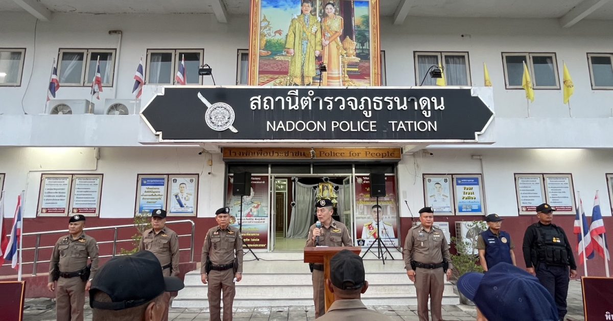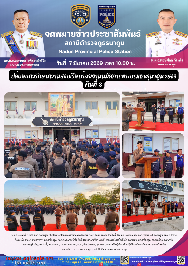 สภ.นาดูน วันนี้ (7 มี.ค.69) เวลา 18.00 น. พ.ต.อ.พงษ์ศักดิ์ วีระศิริ ผกก.สภ.นาดูน เป็นประธานปล่อยแถวรักษาความสงบเรียบร้อยฯ โดยมี พ.ต.ท.ศักดิ์สิทธิ์ ศิริประภานนท์กุล รอง ผกก.(สอบสวน) สภ.นาดูน, พ.ต.ท.สำรวย วิถาทานัง สวป.ฯ ช่วยราชการ สภ.วาปีปทุม, พ.ต.ต.นฤนาท จำรัสรักษ์ สวป.สภ.นาเชือก และข้าราชการตำรวจในสังกัด สภ.นาดูน, สภ.วาปีปทุม, สภ.นาเชือก, สภ.นาข่า, สภ.ราษฎร์เจริญ, สภ.กำพี้, สภ.ปอพาน, กก.สส.ภ.จว.มค., EOD, ฝ่ายปกครอง, ชุด ชรบ., อาสาสมัครกู้ภัยฯ เพื่อปฏิบัติภารกิจการรักษาความสงบเรียบร้อยงานนมัสการพระบรมธาตุนาดูน ประจำปี 2569