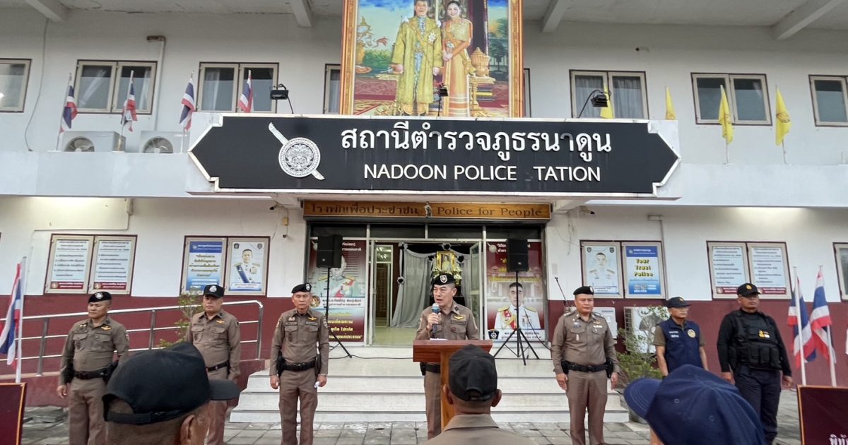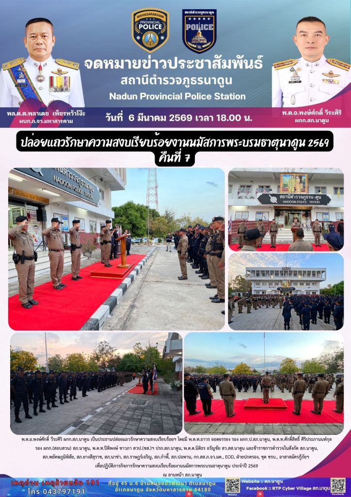 สภ.นาดูน วันนี้ (6 มี.ค.69) เวลา 18.00 น. พ.ต.อ.พงษ์ศักดิ์ วีระศิริ ผกก.สภ.นาดูน เป็นประธานปล่อยแถวรักษาความสงบเรียบร้อยฯ โดยมี พ.ต.ท.ถาวร ยอดยรรยง รอง ผกก.ป.สภ.นาดูน, พ.ต.ท.ศักดิ์สิทธิ์ ศิริประภานนท์กุล รอง ผกก.(สอบสวน) สภ.นาดูน, พ.ต.ท.ปิติพงษ์ ขาวภา สวป.(ชส.)ฯ ปรก.สภ.นาดูน, พ.ต.ต.นิติธร อรัญชัย สว.สส.นาดูน และข้าราชการตำรวจในสังกัด สภ.นาดูน, สภ.พยัคฆภูมิพิสัย, สภ.ยางสีสุราช, สภ.นาข่า, สภ.ราษฎร์เจริญ, สภ.กำพี้, สภ.ปอพาน, กก.สส.ภ.จว.มค., EOD, ฝ่ายปกครอง, ชุด ชรบ., อาสาสมัครกู้ภัยฯ เพื่อปฏิบัติภารกิจการรักษาความสงบเรียบร้อยงานนมัสการพระบรมธาตุนาดูน ประจำปี 2569