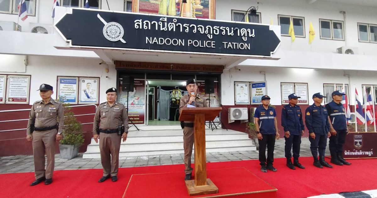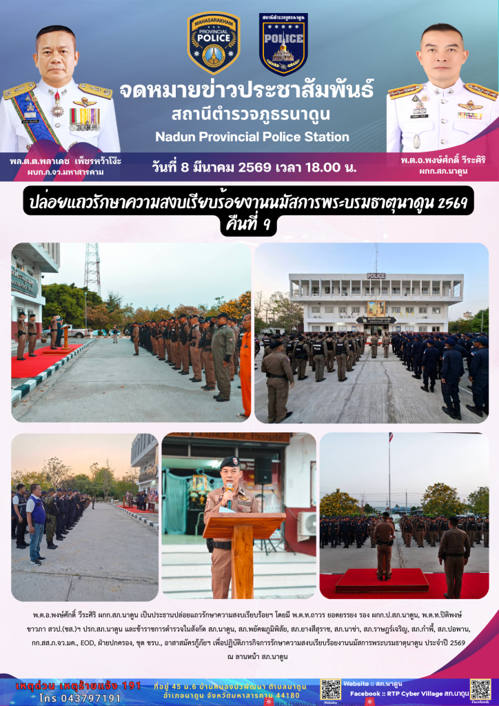 สภ.นาดูน วันนี้ (8 มี.ค.69) เวลา 18.00 น. พ.ต.อ.พงษ์ศักดิ์ วีระศิริ ผกก.สภ.นาดูน เป็นประธานปล่อยแถวรักษาความสงบเรียบร้อยฯ โดยมี พ.ต.ท.ถาวร ยอดยรรยง รอง ผกก.ป.สภ.นาดูน, พ.ต.ท.ปิติพงษ์ ขาวภา สวป.(ชส.)ฯ ปรก.สภ.นาดูน และข้าราชการตำรวจในสังกัด สภ.นาดูน, สภ.พยัคฆภูมิพิสัย, สภ.ยางสีสุราช, สภ.นาข่า, สภ.ราษฎร์เจริญ, สภ.กำพี้, สภ.ปอพาน, กก.สส.ภ.จว.มค., EOD, ฝ่ายปกครอง, ชุด ชรบ., อาสาสมัครกู้ภัยฯ เพื่อปฏิบัติภารกิจการรักษาความสงบเรียบร้อยงานนมัสการพระบรมธาตุนาดูน ประจำปี 2569