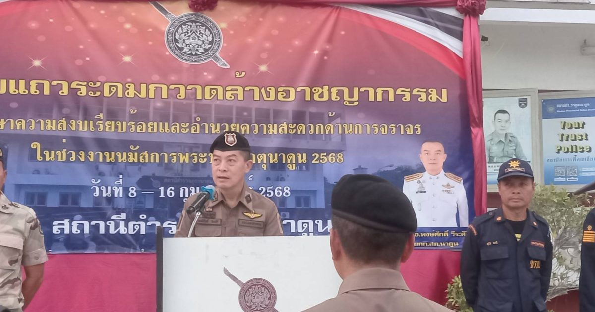 สภ.นาดูน วันนี้(16 ก.พ.2568) เวลา 18.00 น. พ.ต.อ.พงษ์ศักดิ์ วีระศิริ ผกก.สภ.นาดูน ปล่อยแถวข้าราชการตำรวจในสังกัด สภ.นาดูน , สภ.พยัคฆภูมิพิสัย, สภ.กำพี้ , สภ.นาข่า , สภ.ราษฎร์เจริญ , สภ.ปอพาน, กก.สส.ภ.จว.มหาสารคาม, ชุด EOD ภ.จว.มหาสารคาม , จนท.ฝ่ายปกครอง , ชรบ. และอาสาสมัครกู้ภัยนาดูน-ยางนคร ร่วมปล่อยแถวออก ว.4 รักษาความสงบเรียนร้อยงานนมัสการพระบรมธาตุนาดูน ประจำปี 2568 (คืนที่9) และมอบรางวัลให้กับชุดจับกุม ณ ลานหน้า สภ.นาดูน