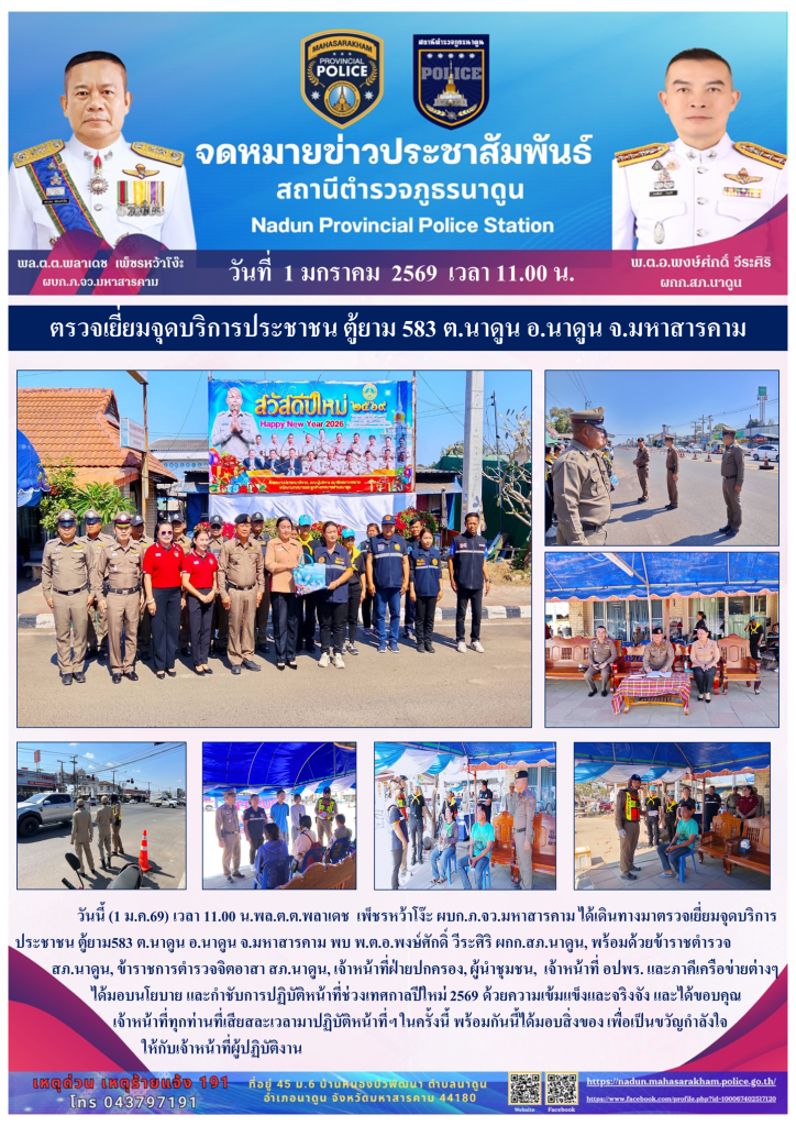 พล.ต.ต.พลาเดช เพ็ชรหว้าโง๊ะ ผบก.ภ.จว.มหาสารคาม ได้เดินทางมาตรวจเยี่ยมจุดบริการประชาชน ตู้ยาม583 ต.นาดูน อ.นาดูน จ.มหาสารคาม