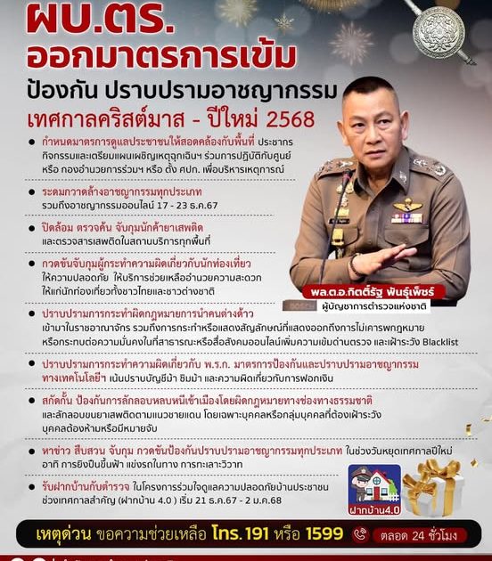 พล.ต.อ.กิตติ์รัฐ พันธุ์เพ็ชร์ ผู้บัญชาการตำรวจแห่งชาติ สั่งการตำรวจทั่วประเทศ กำชับป้องกัน ปราบปรามอาชญากรรม เทศกาลคริสต์มาส – ปีใหม่ 2568 ![]()
