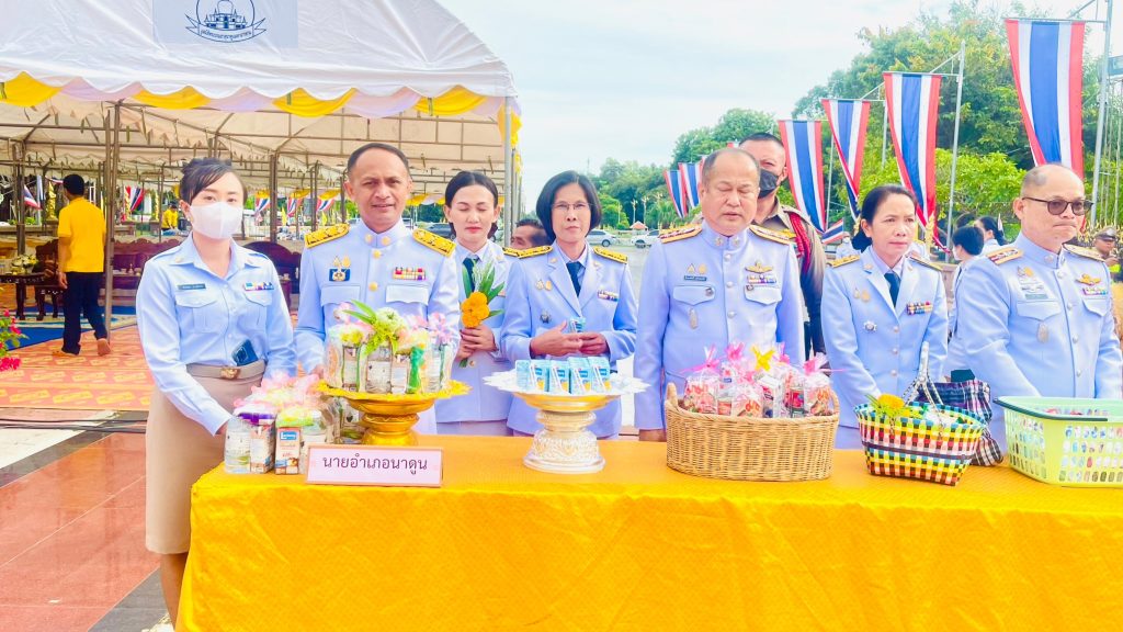 วันนี้ ( 28 ก.ค. 66 ) เวลา 07.00 น. ณ ลานพระบรมธาตุนาดูน อำเภอนาดูน จังหวัดมหาสารคาม พันตำรวจเอกดำรงศักดิ์ แก้วสมนึก ผู้กำกับการสถานีตำรวจภูธรนาดูน, พันตำรวจโท ดร. เดช นิมิตร รองผู้กำกับการสืบสวนสถานีตำรวจภูธรนาดูน พร้อมด้วย หัวหน้าส่วนราชการ, ข้าราชการตำรวจ และประชาชนในพื้นที่ ร่วมพิธีทำบุญตักบาตร เฉลิมพระชนมพรรษา พระบาทสมเด็จพระเจ้าอยู่หัว เนื่องในโอกาสวันเฉลิมพระชนมพรรษา 28 กรกฎาคม 2566 โดยมี นายสัมฤทธิ์ หน่อแก้ว นายอำเภอนาดูน เป็นประธาน