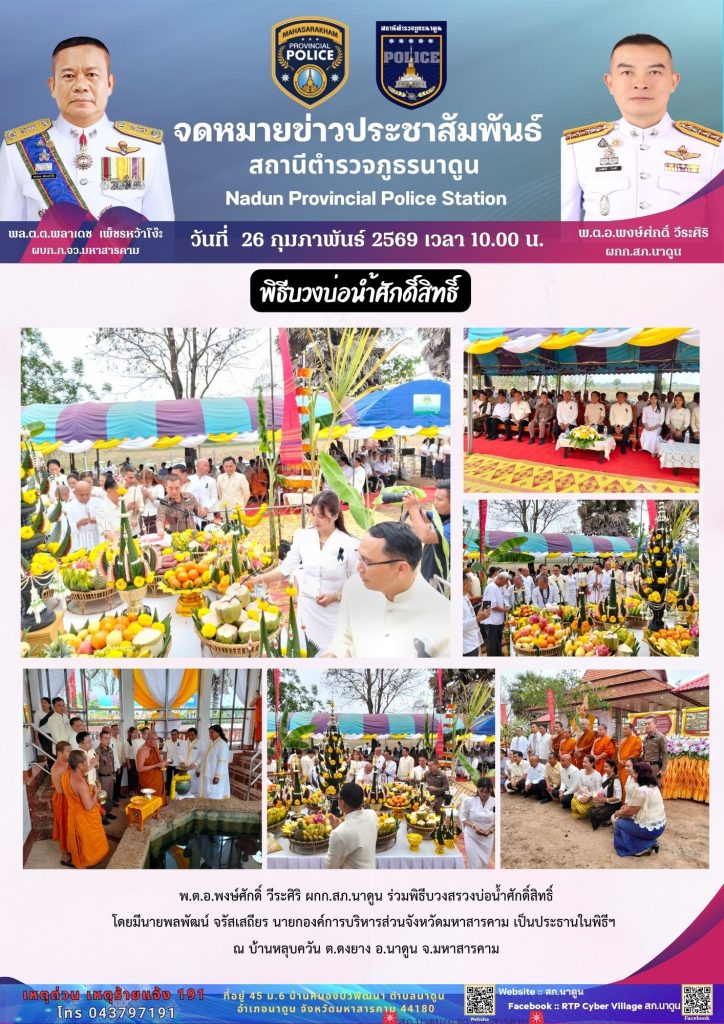 พิธีบวงสรวงบ่อน้ำศักดิ์สิทธิ์ 26 กุมภาพันธ์ 2569 โดย admin / ข่าวภารกิจผู้บังคับบัญชา วันนี้ (26 ก.พ.69) เวลา 10.00 น. พ.ต.อ.พงษ์ศักดิ์ วีระศิริ ผกก.สภ.นาดูน ร่วมพิธีบวงสรวงบ่อน้ำศักดิ์สิทธิ์ โดยมีนายพลพัฒน์ จรัสเสถียร นายกองค์การบริหารส่วนจังหวัดมหาสารคาม เป็นประธานในพิธีฯณ บ้านหลุบควัน ต.ดงยาง อ.นาดูน จ.มหาสารคาม