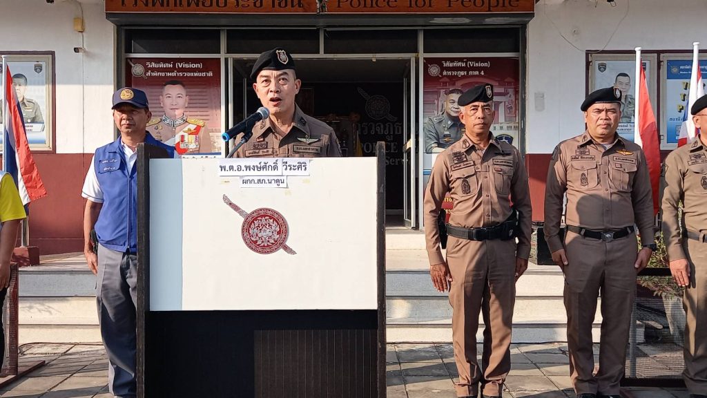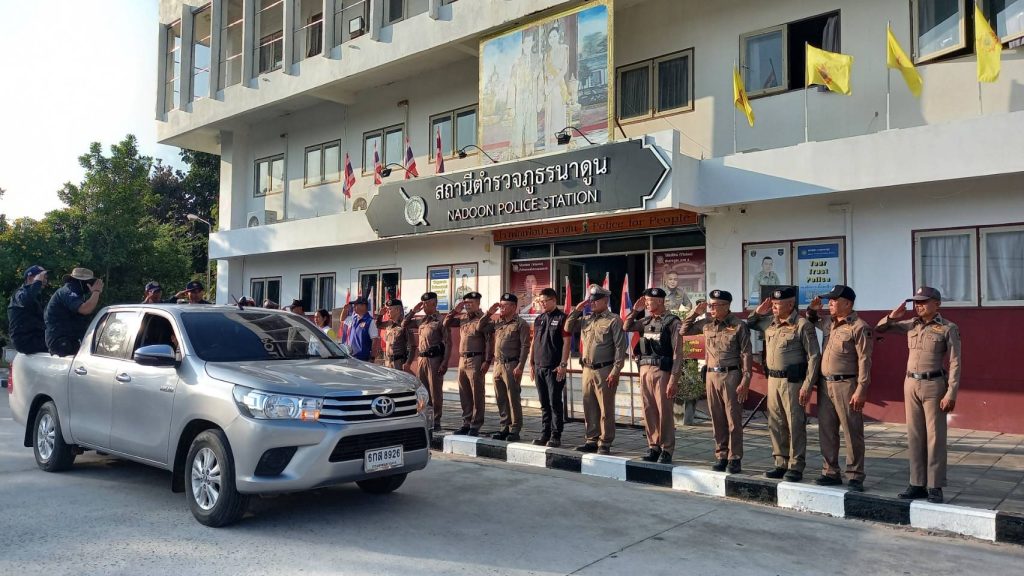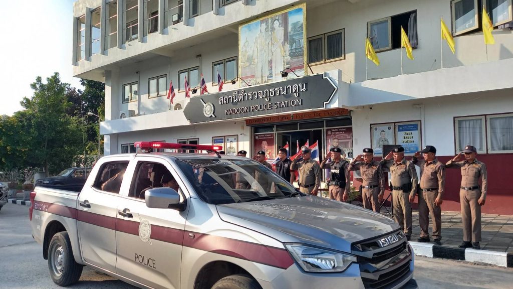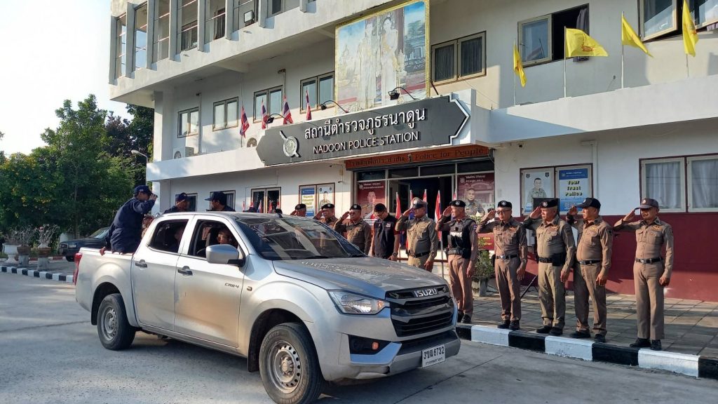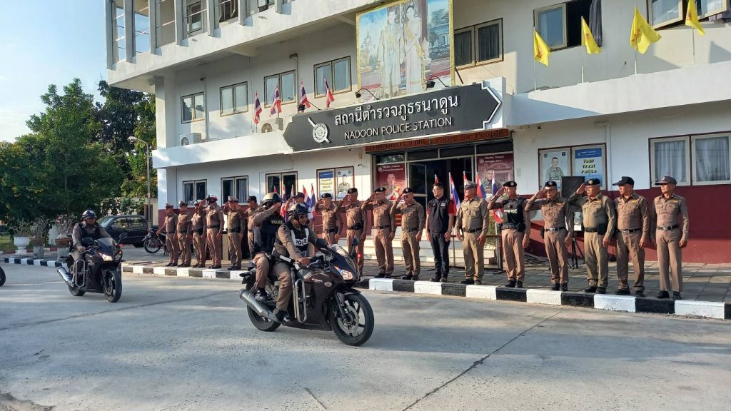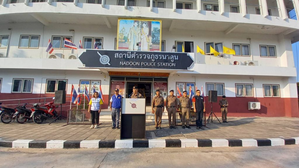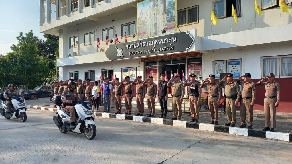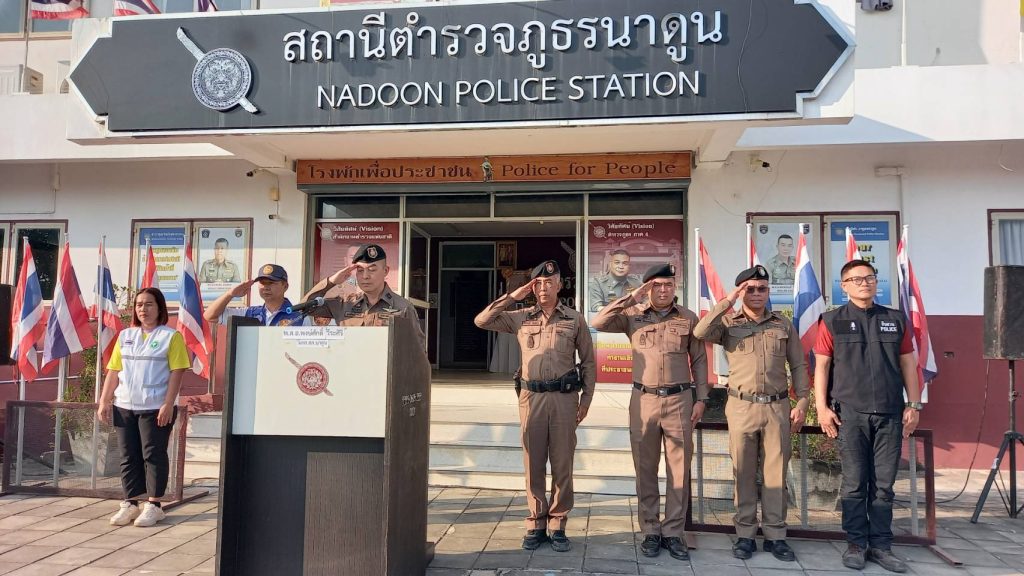สภ.นาดูน วันนี้(8 พ.ย.67) เวลา 16.00 น. พ.ต.อ.พงษ์ศักดิ์ วีระศิริ ผกก.สภ.นาดูน, พ.ต.ท.กิตติพงศ์ เขียวหวาน รอง ผกก.ป.ฯ, พ.ต.ท.ศักดิ์สิทธิ์ ศิริประภานนท์กุล รอง ผกก.(สอบสวน)ฯ, พ.ต.ท.ปริญญา นามภักดิ์ รอง ผกก.สส.ฯ, พ.ต.ท.บุญเลี้ยง หล้าอ่อน สว.(สอบสวน)ฯ นำข้าราชการตำรวจ สภ.นาดูน พร้อมด้วยฝ่ายปกครอง, สาธารณสุข อ.นาดูน ร่วมพิธีปล่อยแถวระดมกวาดล้างอาชญากรรม ตามมาตรการป้องกันปราบปรามในช่วงเทศกาลประเพณีลอยกระทง 2567 ณ ลานหน้า สภ.นาดูน