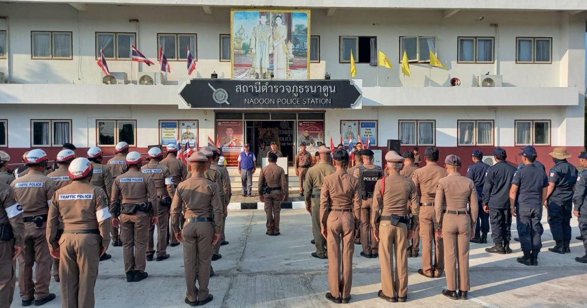สภ.นาดูน วันนี้(8 พ.ย.67) เวลา 16.00 น. พ.ต.อ.พงษ์ศักดิ์ วีระศิริ ผกก.สภ.นาดูน, พ.ต.ท.กิตติพงศ์ เขียวหวาน รอง ผกก.ป.ฯ, พ.ต.ท.ศักดิ์สิทธิ์ ศิริประภานนท์กุล รอง ผกก.(สอบสวน)ฯ, พ.ต.ท.ปริญญา นามภักดิ์ รอง ผกก.สส.ฯ, พ.ต.ท.บุญเลี้ยง หล้าอ่อน สว.(สอบสวน)ฯ นำข้าราชการตำรวจ สภ.นาดูน พร้อมด้วยฝ่ายปกครอง, สาธารณสุข อ.นาดูน ร่วมพิธีปล่อยแถวระดมกวาดล้างอาชญากรรม ตามมาตรการป้องกันปราบปรามในช่วงเทศกาลประเพณีลอยกระทง 2567 ณ ลานหน้า สภ.นาดูน
