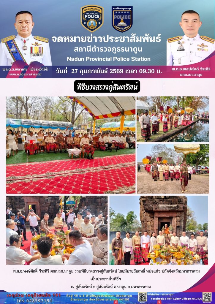 ร่วมพิธีบวงสรวงกู่สันตรัตน์ 27 กุมภาพันธ์ 2569 โดย admin / ข่าวภารกิจผู้บังคับบัญชา วันนี้ (27 ก.พ.69) เวลา 09.30 น. พ.ต.อ.พงษ์ศักดิ์ วีระศิริ ผกก.สภ.นาดูน ร่วมพิธีบวงสรวงกู่สันตรัตน์ โดยมีนายสัมฤทธิ์ หน่อแก้ว ปลัดจังหวัดมหาสารคาม เป็นประธานในพิธีฯณ กู่สันตรัตน์ ต.กู่สันตรัตน์ อ.นาดูน จ.มหาสารคาม