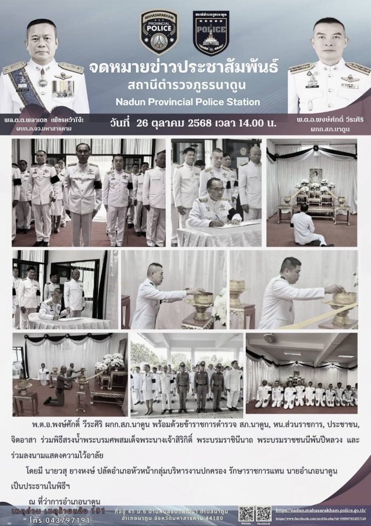 สภ.นาดูน วันนี้ ( 26 ต.ค. 68) เวลา 14.00 น. พ.ต.อ.พงษ์ศักดิ์ วีระศิริ ผกก.สภ.นาดูน พร้อมด้วยข้าราชการตำรวจ สภ.นาดูน, หน.ส่วนราชการ, ประชาชน, จิตอาสา ร่วมพิธีสรงน้ำพระบรมศพสมเด็จพระนางเจ้าสิริกิติ์ พระบรมราชินีนาถ พระบรมราชชนนีพันปีหลวง และร่วมลงนามแสดงความไว้อาลัย