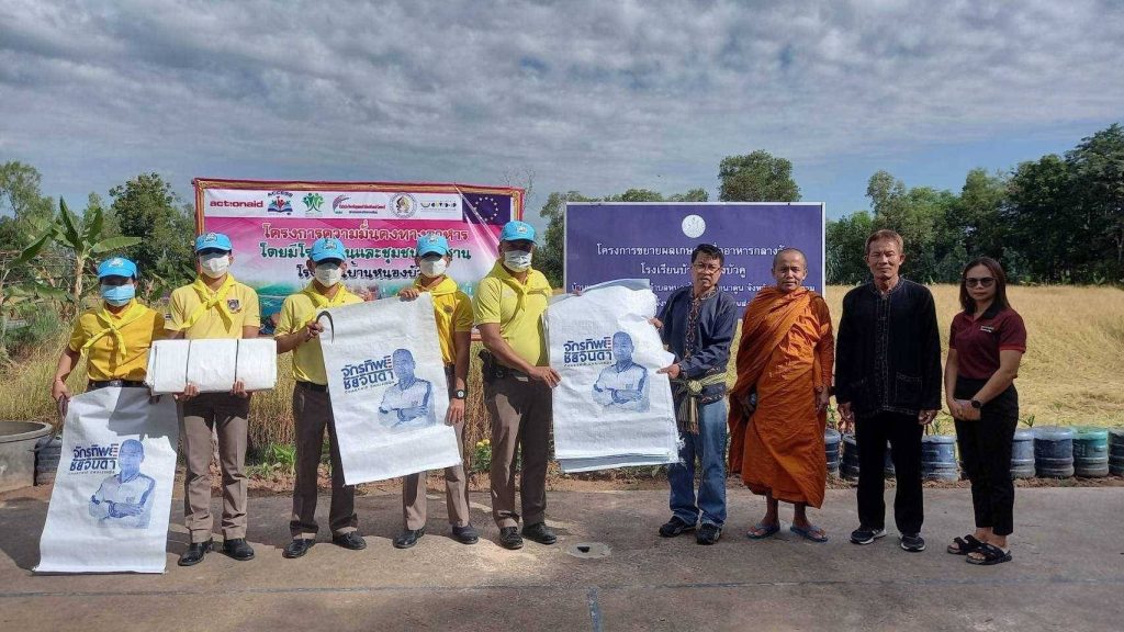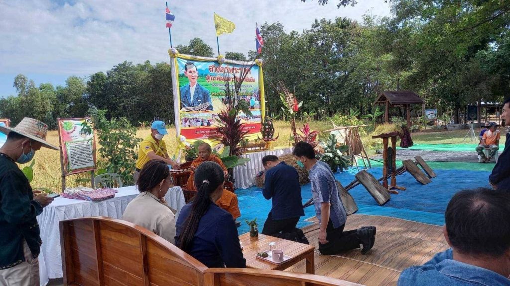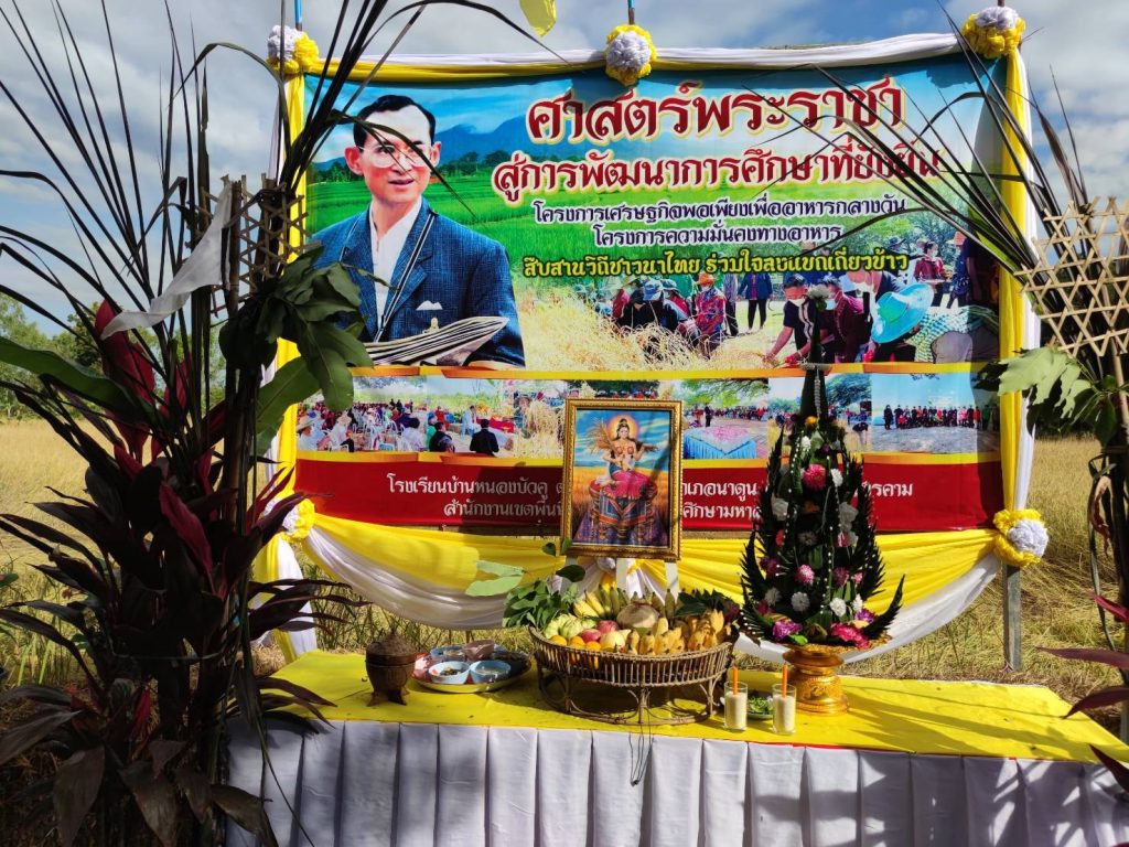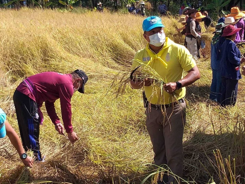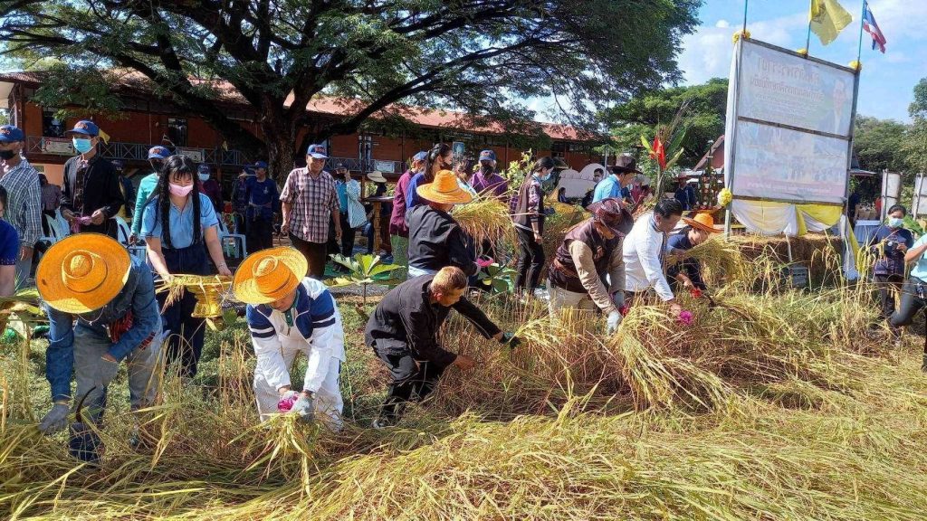 สภ.นาดูน วันนี้ (18 พ.ย 65) เวลา 09.00 น. พ.ต.ท.ดร. เดช นิมิตร รรท.ผกก.สภ.นาดูน มอบหมายให้ พ.ต.ท.นาวิน อุ่นใจชน รอง ผกก.ป.ฯพร้อมด้วยตำรวจจิตอาสา สภ.นาดูน10นาย ผู้อำนวยการโรงเรียนในเขตอำเภอนาดูน เกษตรจังหวัดมหาสารคาม เกษตรอำเภอนาดูน เทศบาลตำบลหนองไผ่ ผู้นำชุมชน และประชาชนบ้านหนองบัวคู ร่วมกิจกรรม สืบสารวิธีชาวไทย ร่วมใจลงแขกเกี่ยวข้าว ศาสตร์พระราชา สู่การพัฒนาที่ยั่งยืน ตามโครงการ เศรษฐกิจพอเพียงเพื่ออาหารกลางวัน ณ โรงเรียนบ้านหนองบัวคู ม.4 ต.หนองไผ่ ต.นาดูน อ.นาดูน จ.มหาสารคาม โดยมี ว่าที่ร้อยตรี สุรสิทธิ์ กิตย์สมบูรณ์ ผอ.สพป.มหาสารคาม เขต2 เป็นประธานในพิธี