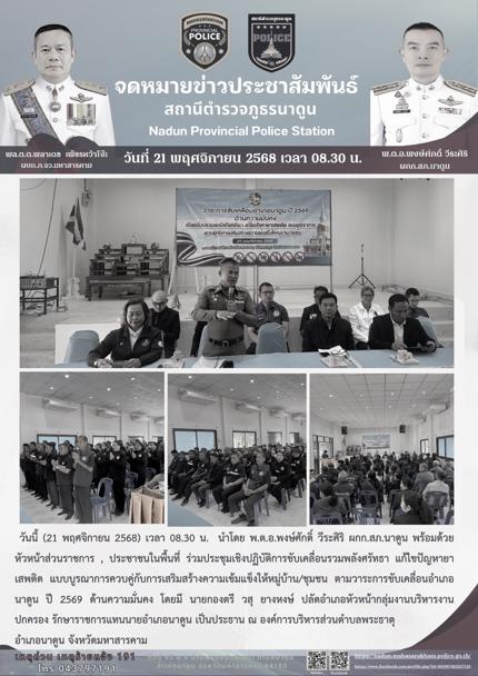 สภ.นาดูน วันนี้ (21 พ.ย.68) เวลา 08.30 น. พ.ต.อ.พงษ์ศักดิ์ วีระศิริ ผกก.สภ.นาดูน พร้อมด้วยหัวหน้าส่วนราชการ, ประชาชนในพื้นที่ ร่วมประชุมเชิงปฏิบัติการขับเคลื่อนรวมพลังศรัทธา แก้ไขปัญหายาเสพติด แบบบูรณาการควบคู่กับการเสริมสร้างความเข้มแข็งให้หมู่บ้าน/ชุมชน ตามวาระการขับเคลื่อนอำเภอนาดูน ปี 2569 ด้านความมั่นคง