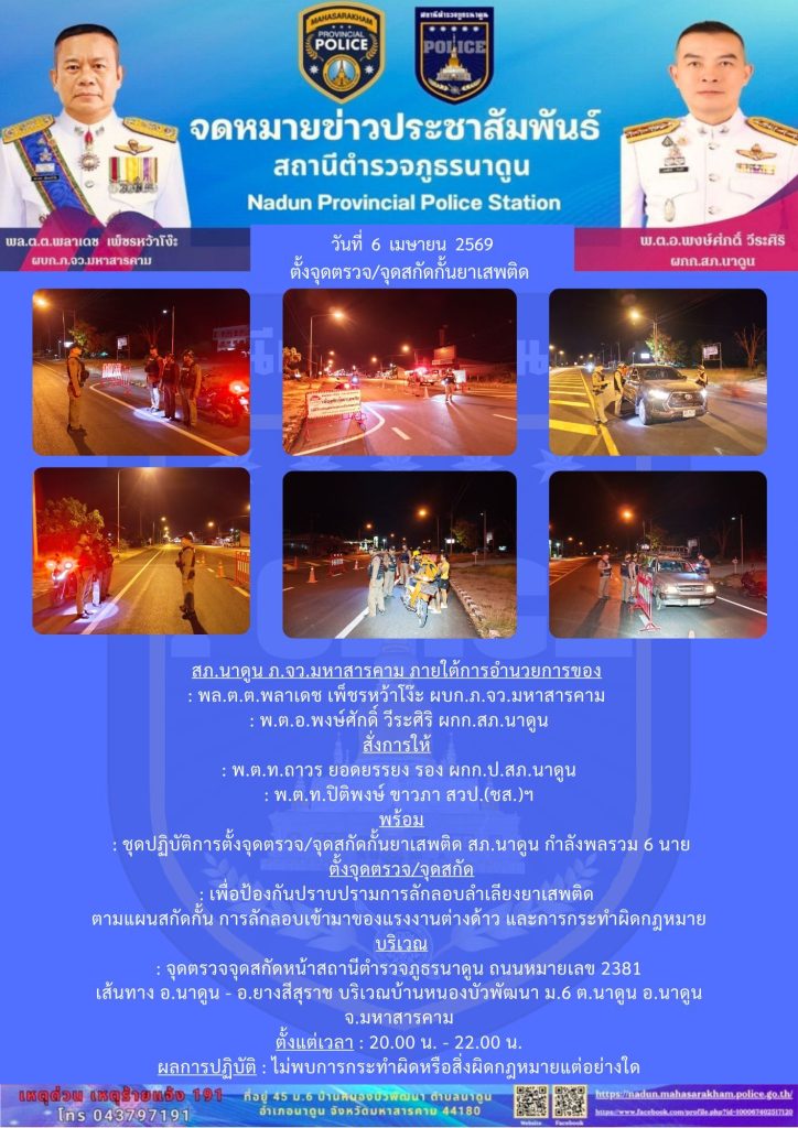 ว.1 : จุดตรวจจุดสกัดหน้าสถานีตำรวจภูธรนาดูน ถนนหมายเลข 2381 เส้นทาง อ.นาดูน – อ.ยางสีสุราช บริเวณบ้านหนองบัวพัฒนา ม.6 ต.นาดูน อ.นาดูน จ.มหาสารคาม