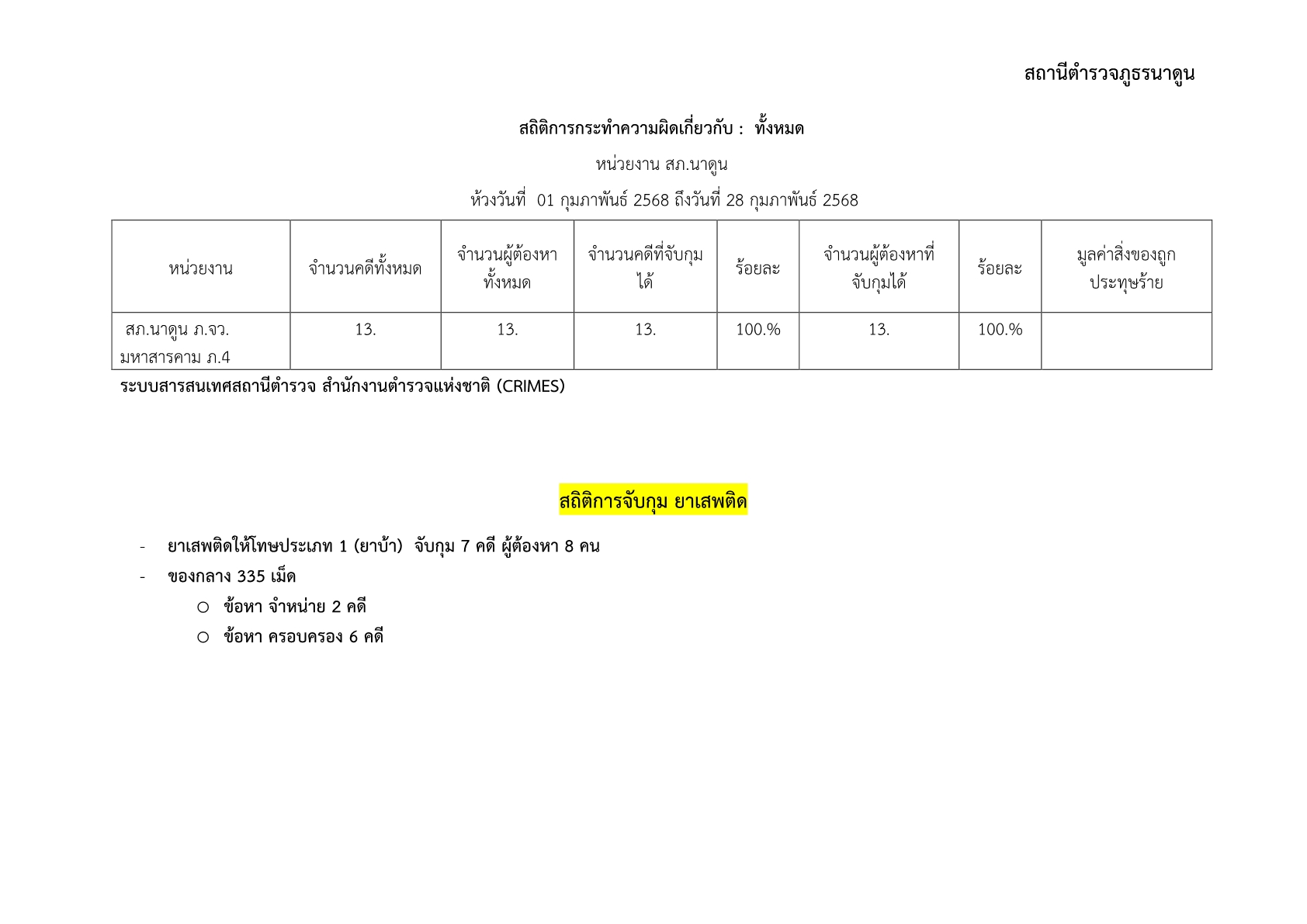 สรุปผลการปฏิบัติงานสอบสวน เดือน กุมภาพันธ์ 2568