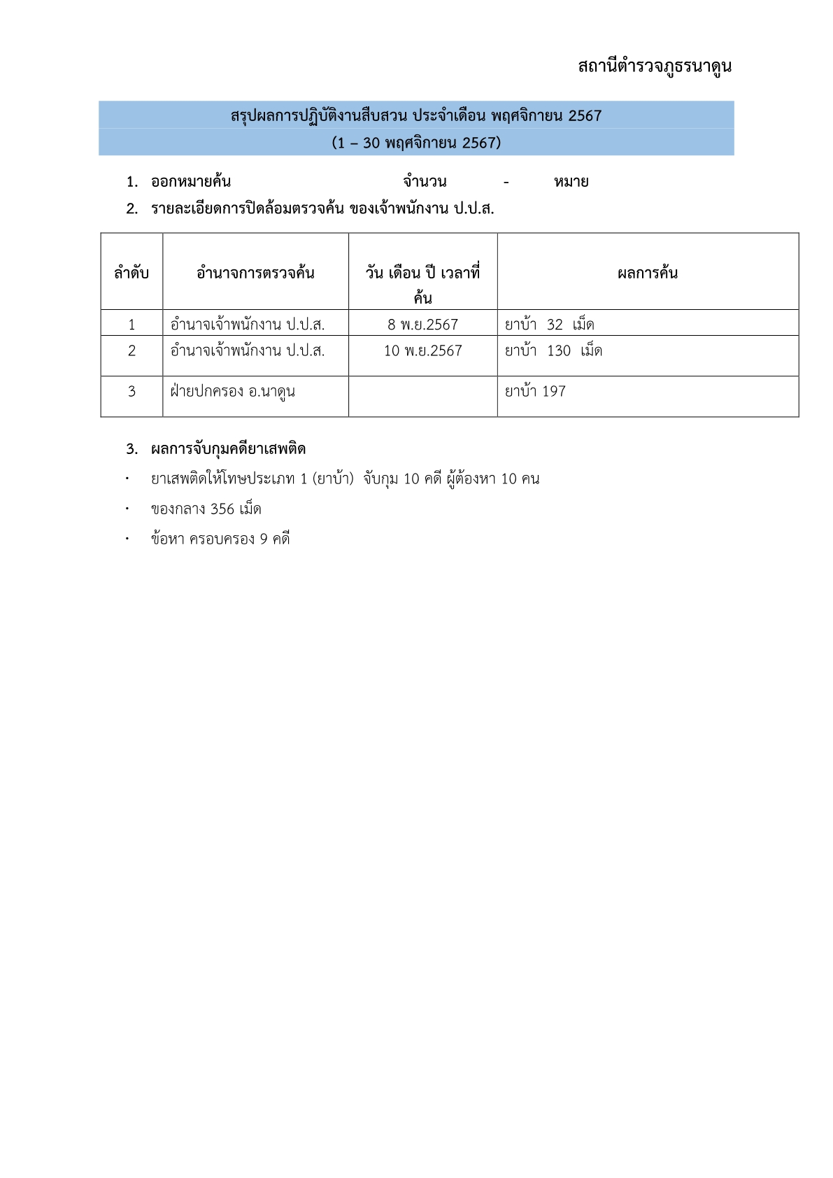 สรุปผลการปฏิบัติงานสืบสวน เดือน พฤศจิกายน 2567