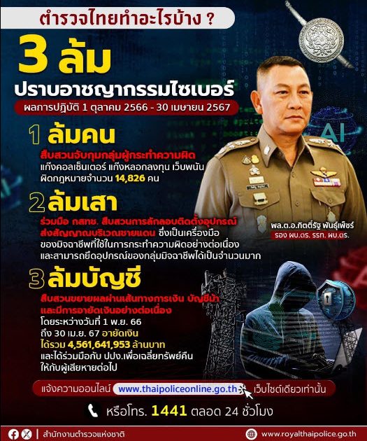 สำนักงานตำรวจแห่งชาติมุ่งมั่นคุ้มครองประชาชนจากภัยอาชญากรรมไซเบอร์ เดินหน้า “ล้มคน-ล้มเสา-ล้มบัญชี”