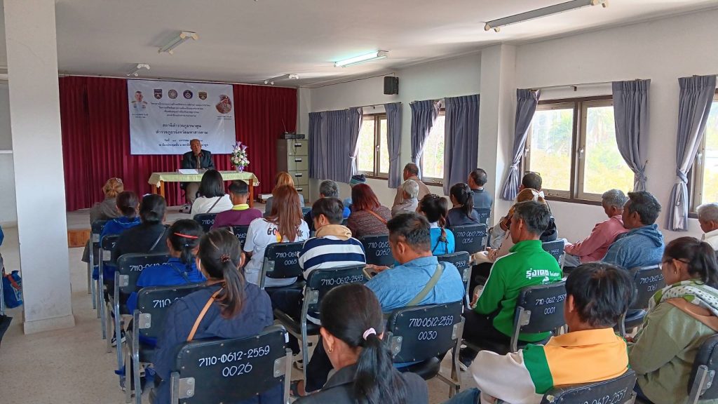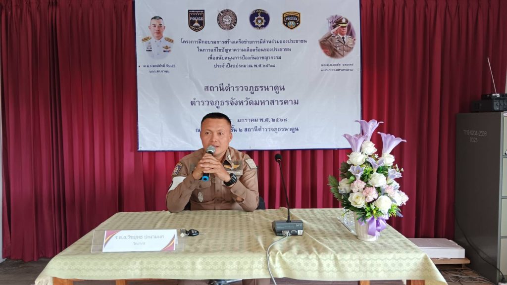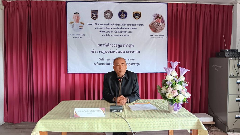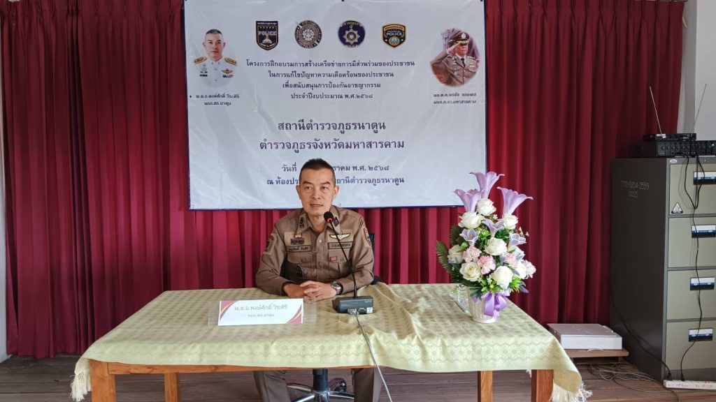 พ.ต.อ.พงษ์ศักดิ์ วีระศิริ ผกก.สภ.นาดูน ,พ.ต.ท.กิตติพงศ์ เขียวหวาน รอง ผกก.ป.ฯ พร้อมชุด กต.ตร.สภ.นาดูน, ชมส.สภ.นาดูน ดำเนินการอบรมโครงการสร้างเครือข่ายการมีส่วนร่วมของประชาชนในการแก้ไขปัญหาความเดือดร้อนของประชาชนในระดับสถานีตำรวจเพื่อสนับสนุนการป้องกันอาชญากรรม ประจำปีงบประมาณ พ.ศ.2568 ณ ห้องประชุมชั้น2 สภ.นาดูน โดยมี กำนัน/ผู้ใหญ่บ้าน/ผู้นำชุมชน/ อสม.และ ประชาชน จำนวน 50 คน เข้าร่วมอบรมตามโครงการฯ