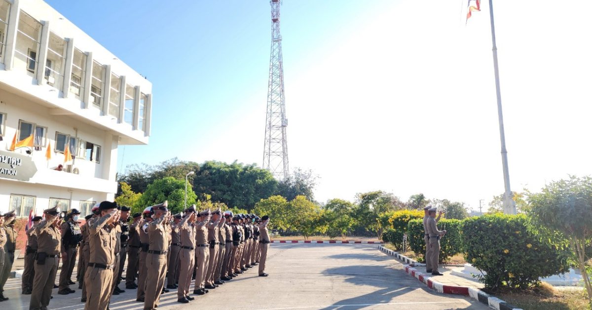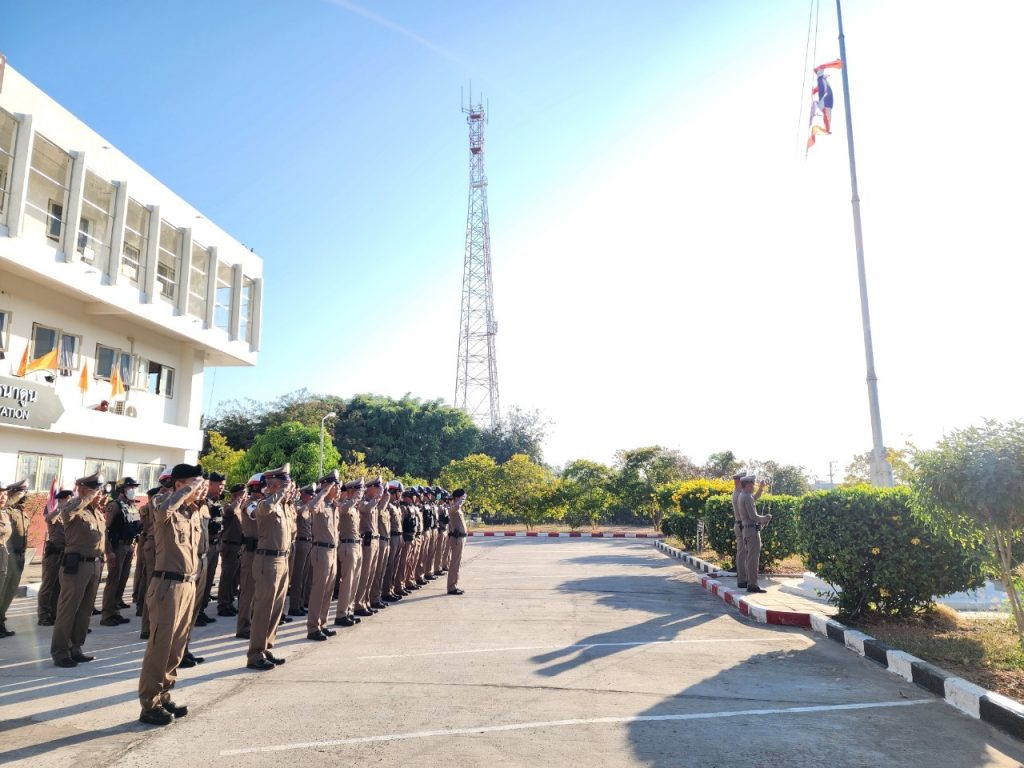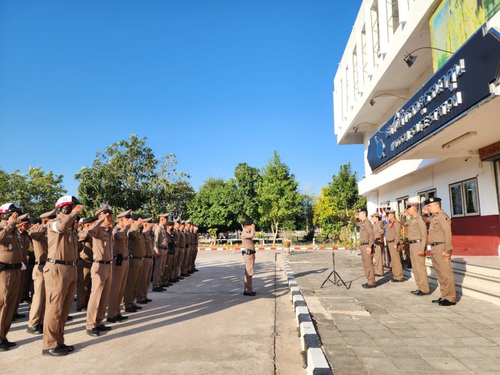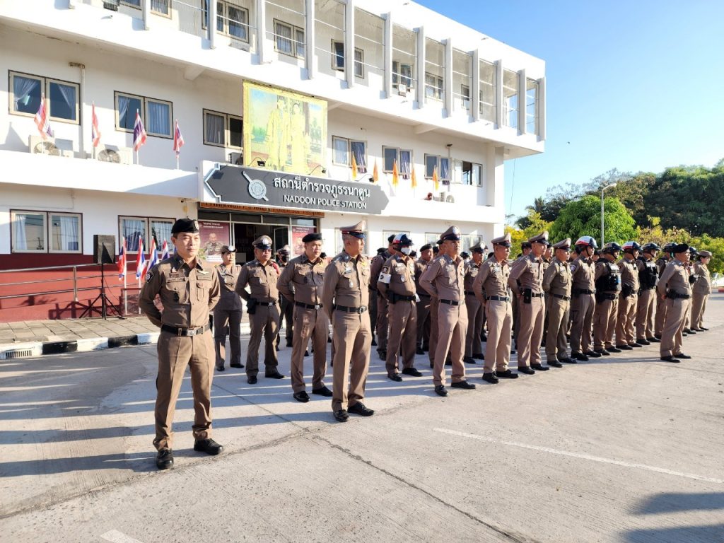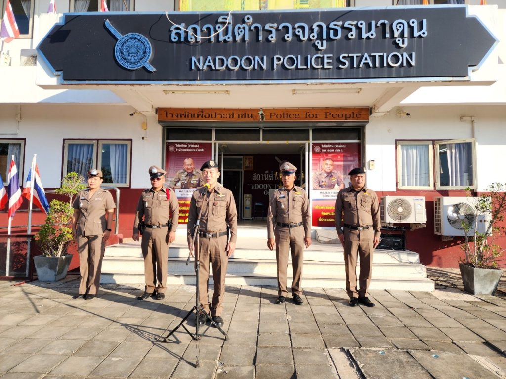 วันที่ 9 มกราคม 2567 เวลา 08.00 น. พ.ต.อ.พงษ์ศักดิ์ วีระศิริ ผกก.สภ.นาดูน พร้อมด้วย พ.ต.ท.กิตติพงศ์ เขียวหวาน รอง ผกก.ป.ฯ, พ.ต.ท.ศักดิ์สิทธิ์ ศิริประภานนท์กุล รอง ผกก.(สอบสวน)ฯ, พ.ต.ท.ณัฐวัฒน์ เจือมา สว.สส.ฯ, พ.ต.ท.บุญเลี้ยง หล้าอ่อน สว.(สอบสวน)ฯ, พ.ต.ต.คมสรรค์ สวัสดิ์นะที สวป.ฯ นำข้าราชการตำรวจในสังกัด เคารพธงชาติ สวดมนต์ไหว้พระ กล่าวอุดมคติ บทปลงใจ