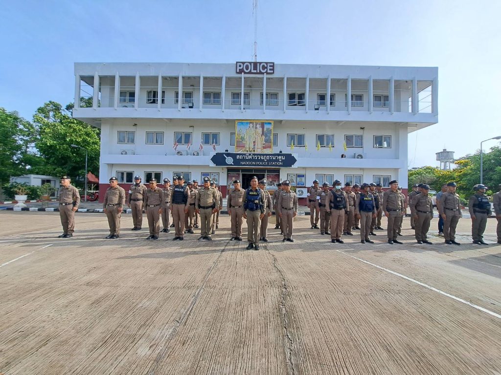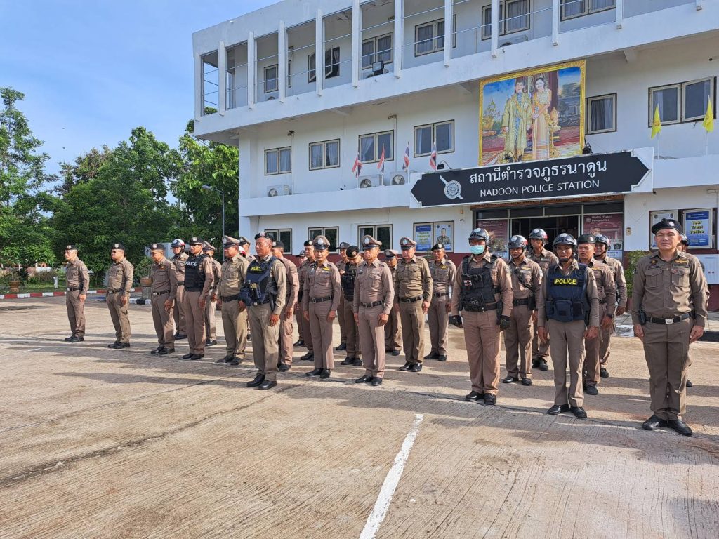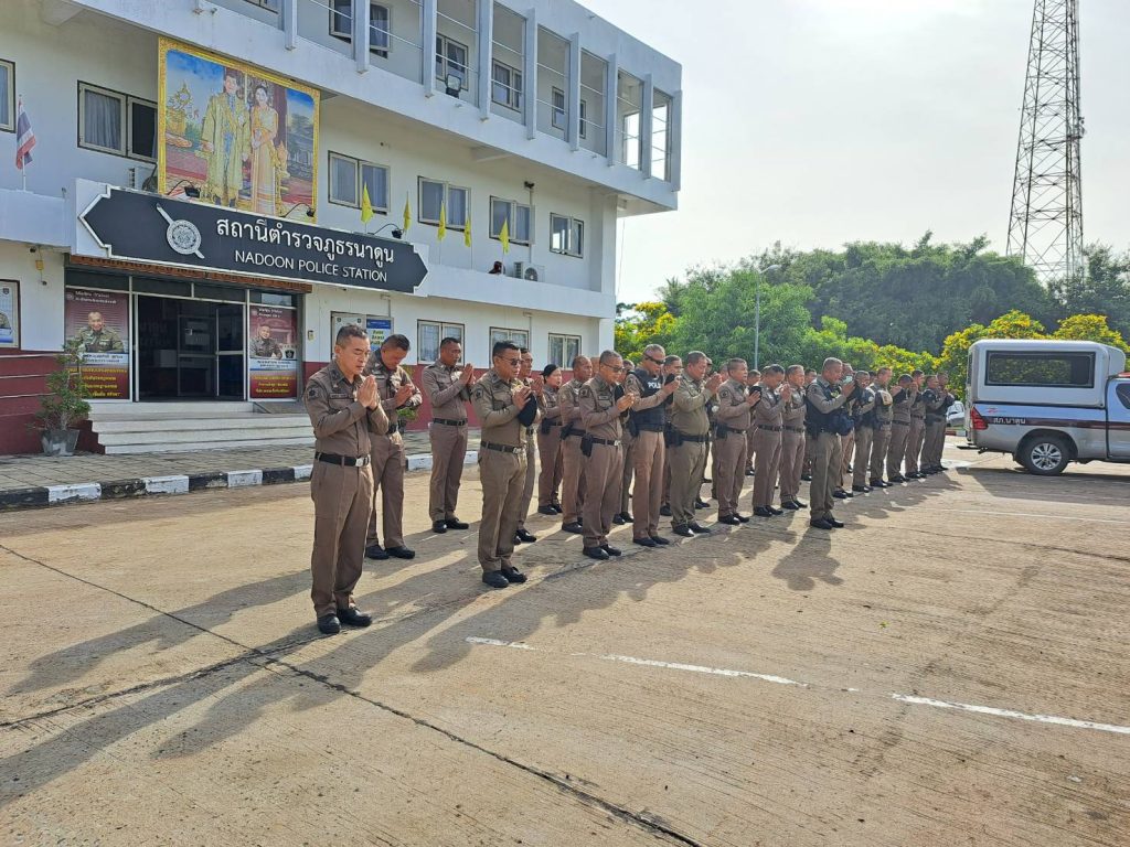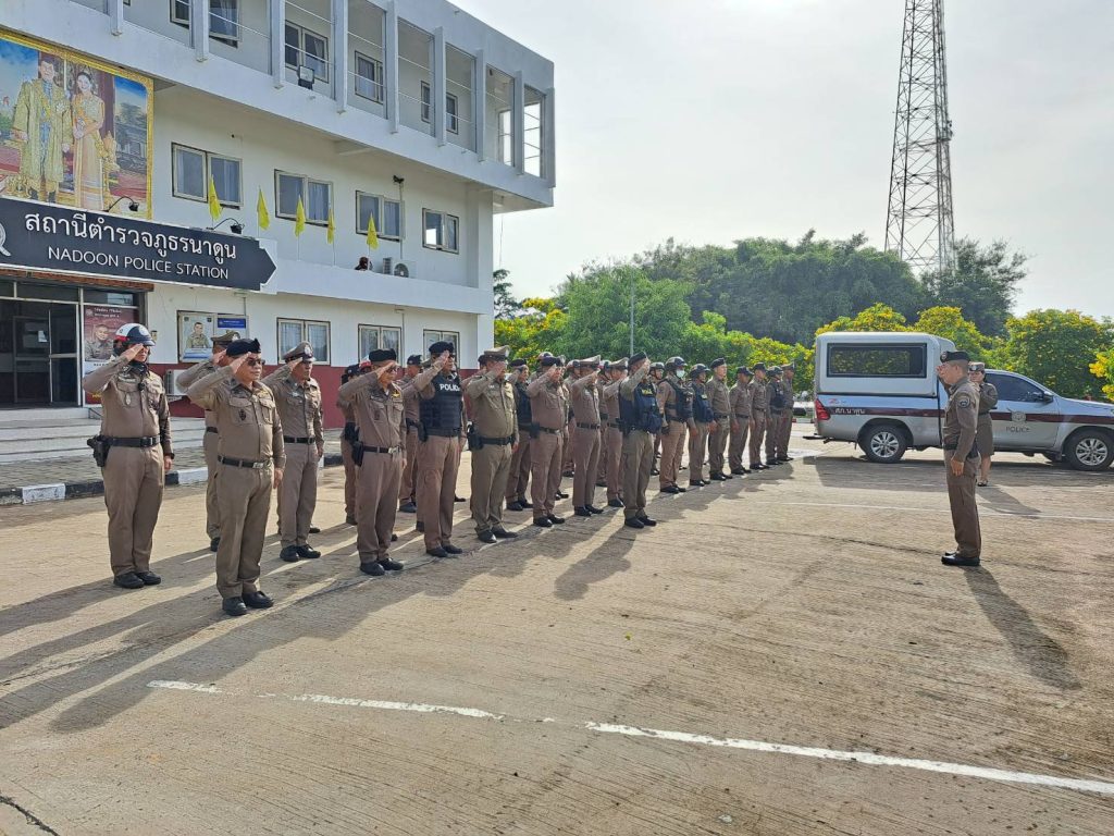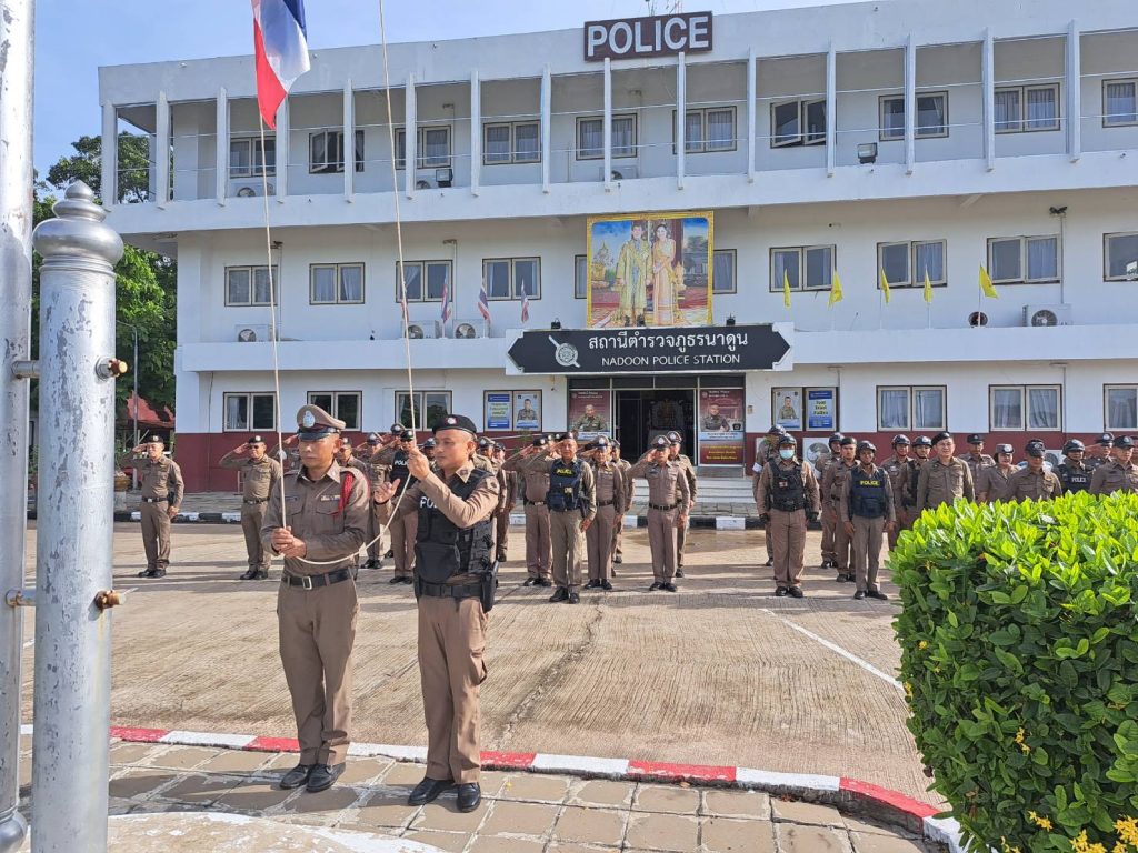 สภ.นาดูน วันที่ 18 มิถุนายน 2567 เวลา 08.00 น. พ.ต.อ.พงษ์ศักดิ์ วีระศิริ ผกก.สภ.นาดูน , พ.ต.ท.กิตติพงศ์ เขียวหวาน รอง ผกก.ป.สภ.นาดูน นำข้าราชการตำรวจ สภ.นาดูน เคารพธงชาติ สวดมนต์ไหว้พระ กล่าวอุดมคติตำรวจ คำปฏิญาณตน วิสัยทัศน์ของผู้บังคับบัญชา ประชุมชี้แจงภารกิจ ข้อราชการจากผู้บังคับบัญชาและกำชับการปฏิบัติหน้าที่ ฝึกทบทวนยุทธวิธีตำรวจ ณ ลานหน้า สภ.นาดูน