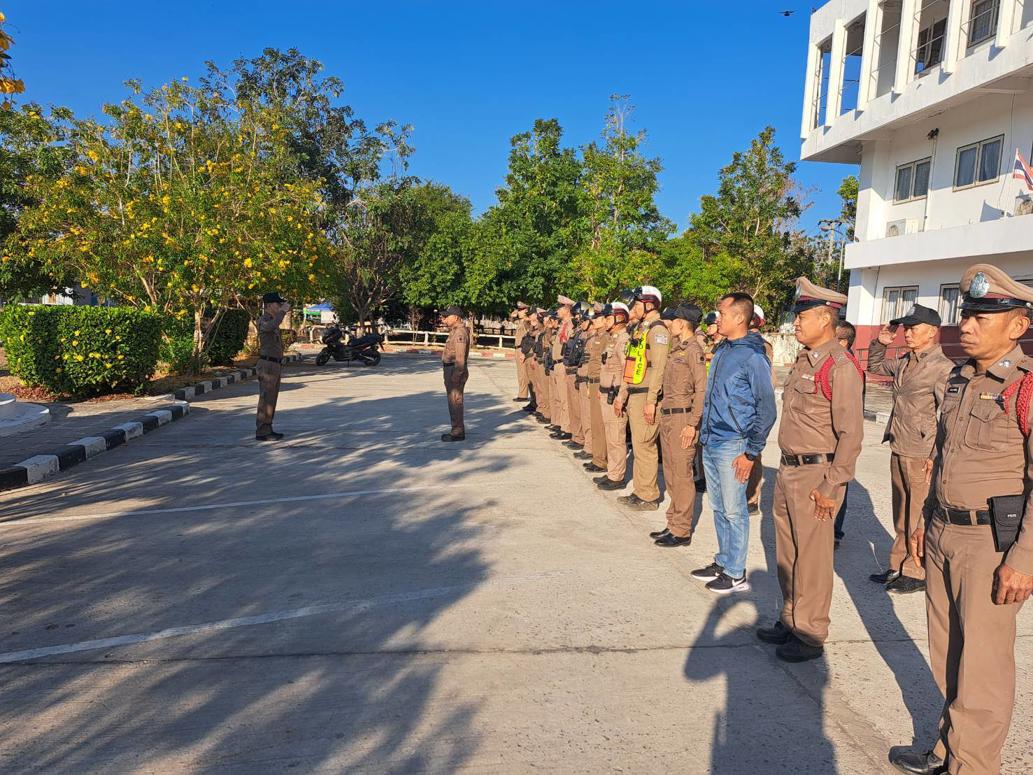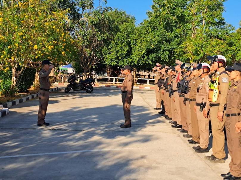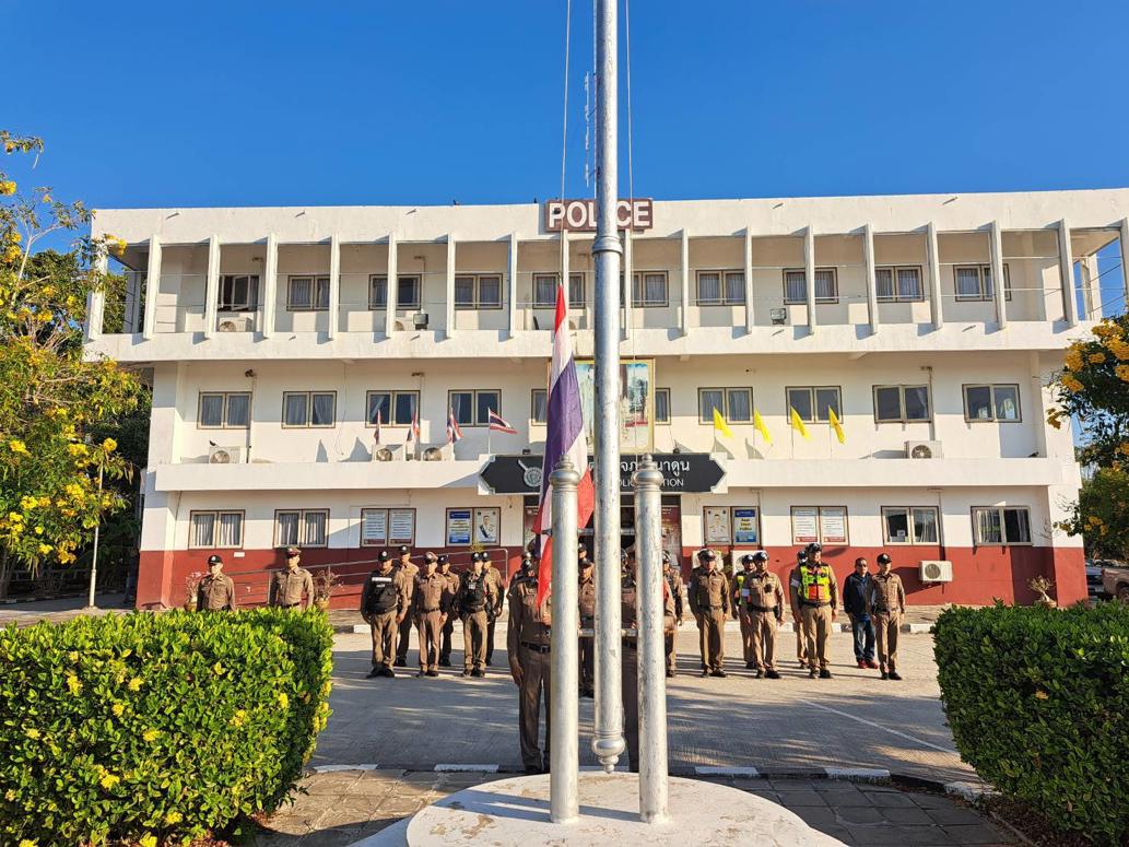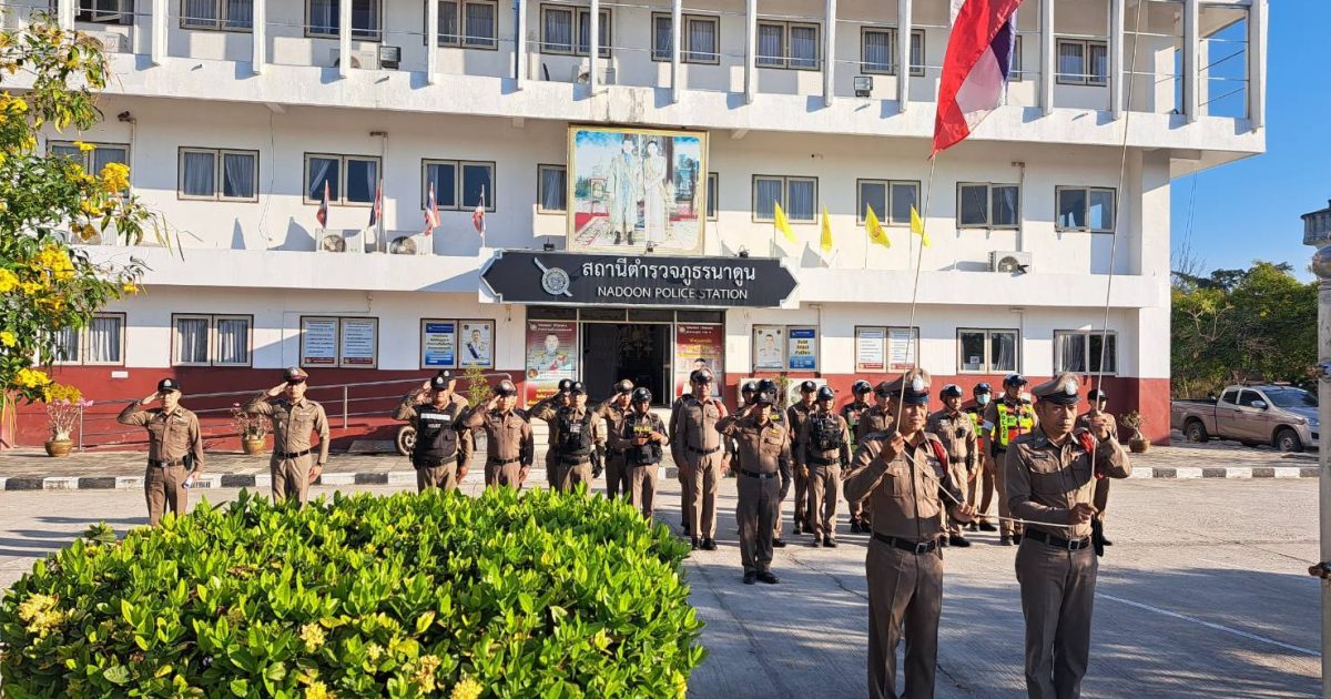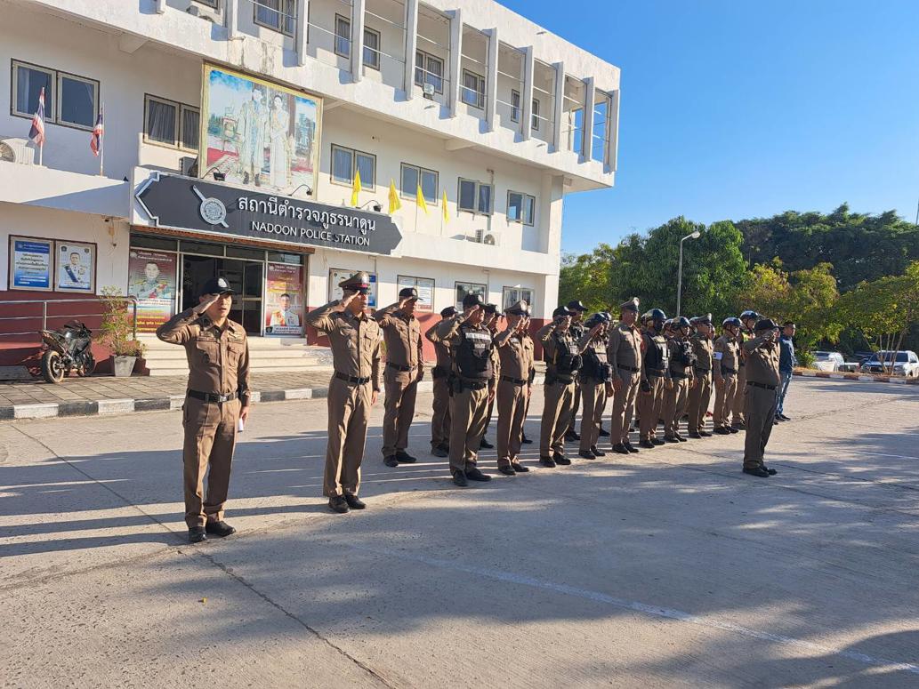 นำแถวสายตรวจรถยนต์ จักรยานยนต์ สิบเวร และข้าราชการตำรวจ สภ.นาดูน เคารพธงชาติ สวดมนต์ไหว้พระ กล่าวอุดมคติตำรวจ คำปฏิญาณตน วิสัยทัศน์ของผู้บังคับบัญชา ประชุมชี้แจงภารกิจ ข้อราชการและกำชับการปฏิบัติ ฝึกทบทวนยุทธวิธีตำรวจ ปล่อยแถวออก ว.4