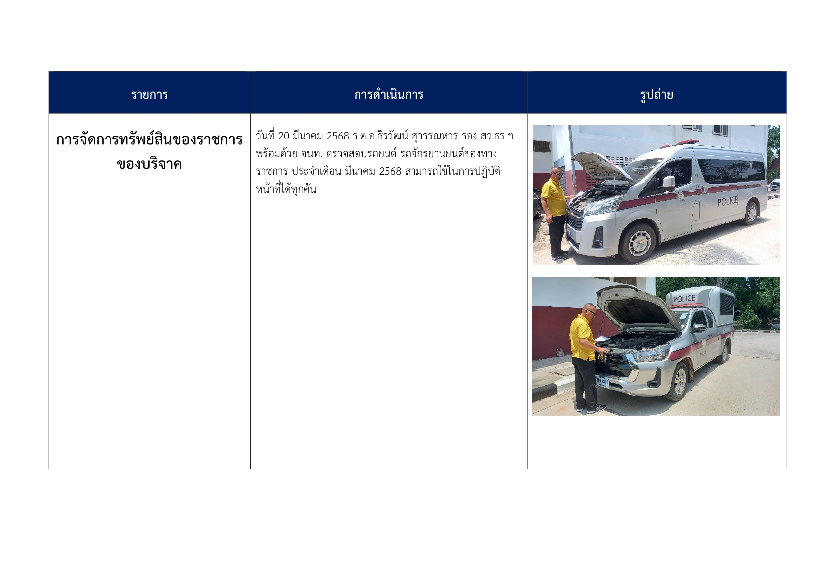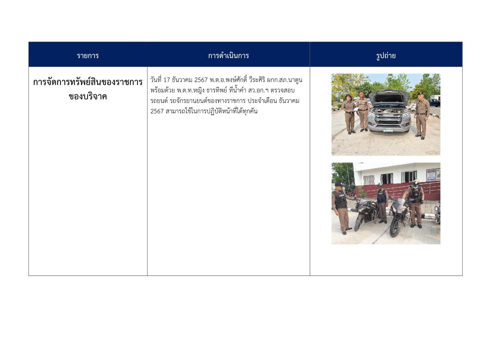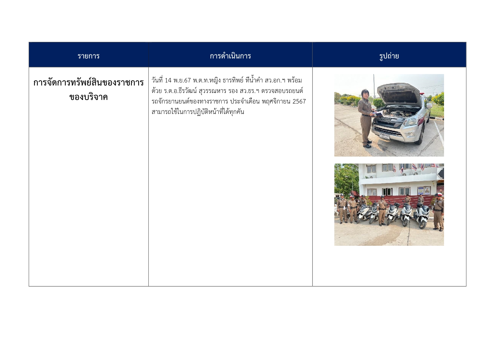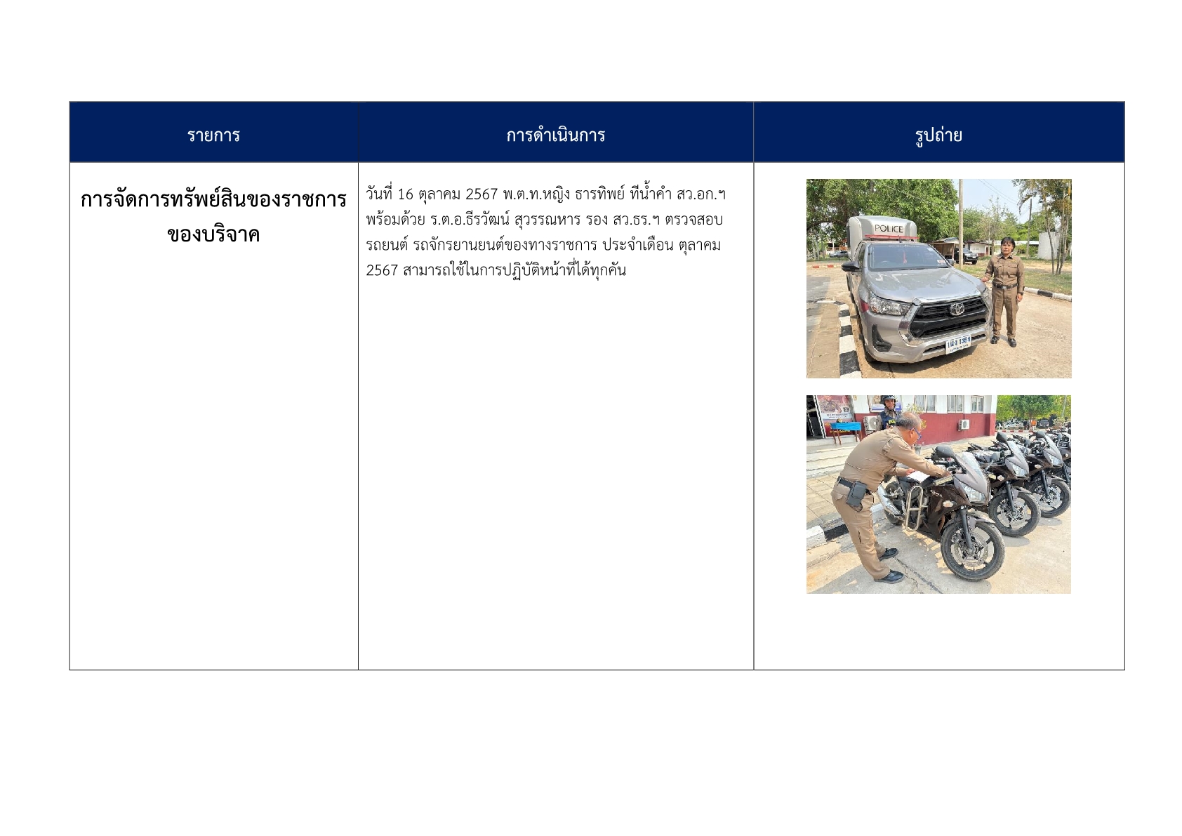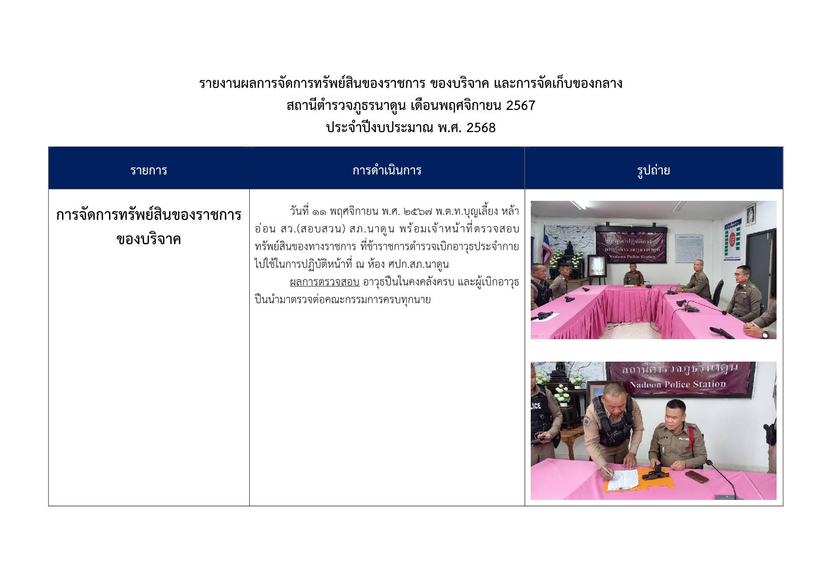 3. ได้มีการอบรมให้ความรู้เกี่ยวกับการจัดการทรัพย์สินของทางราชการ ของบริจาค และการจัดเก็บของกลาง เพื่อให้ข้าราชการตำรวจมีความเข้าใจถึงแนวทาง วิธีการจัดเก็บ การบำรุงรักษา การเบิก การคืน สิ่งของหลวง การดูแลรักษาสิ่งของบริจาค และการจัดเก็บของกลางในคดีอาญา จราจร การคืนของกลาง และกำชับให้ปฏิบัติตามระเบียบอย่างเคร่งครัด