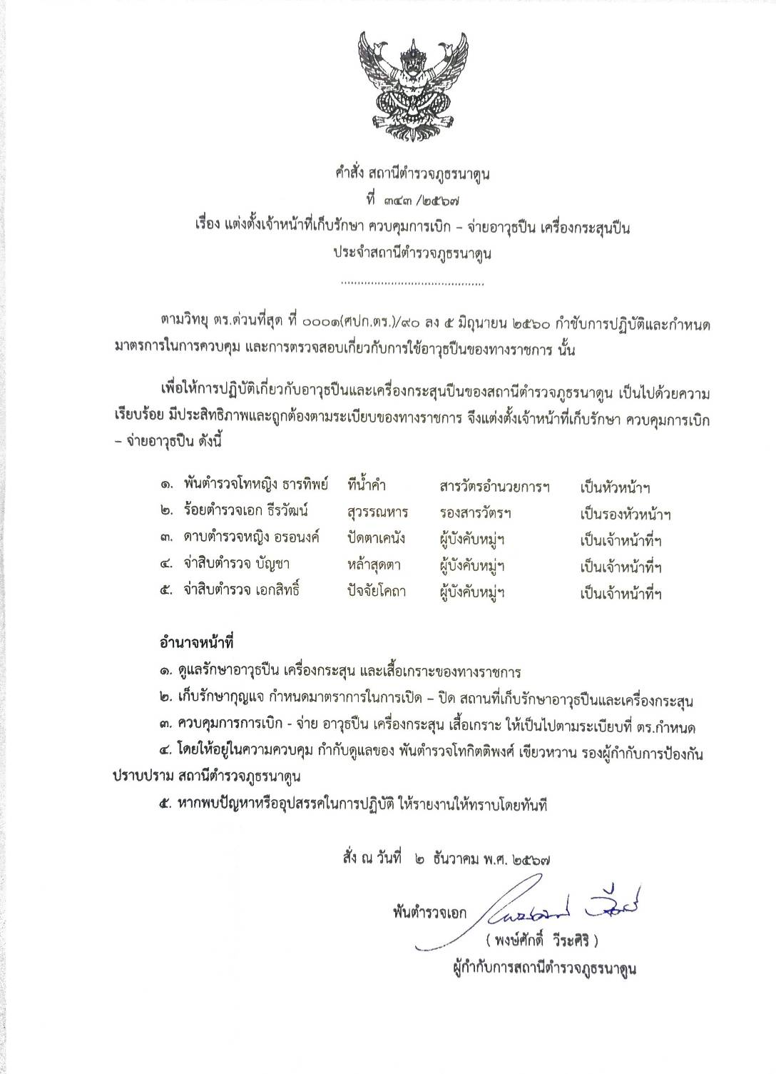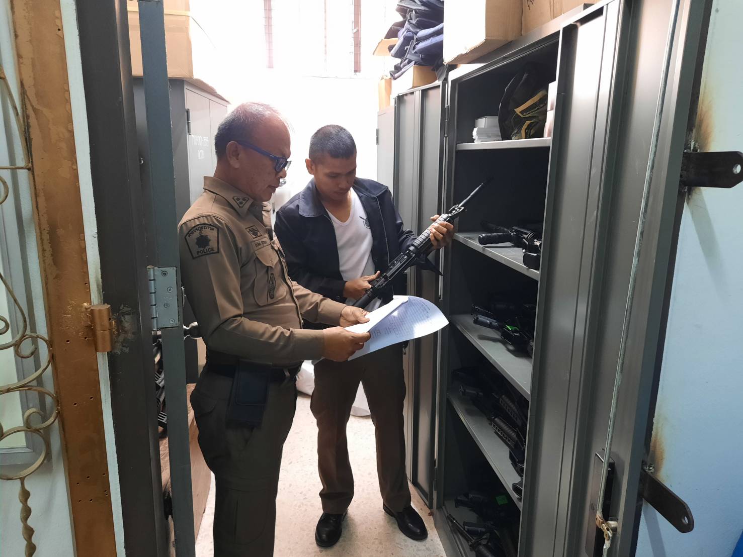 มีการตรวจสอบ อาวุธ ยุทธภัณฑ์ สิ่งของหลวง ของบริจาคเป็นประจำทุกเดือน มีสมุดคุมการเบิกจ่ายสิ่งของหลวง และวัสดุครุภัณฑ์ ห้องจัดเก็บอาวุธยุทธภัณฑ์มีความมั่นคงแข็งแรง แยกออกจากห้องเก็บพัสดุครุภัณฑ์อื่น