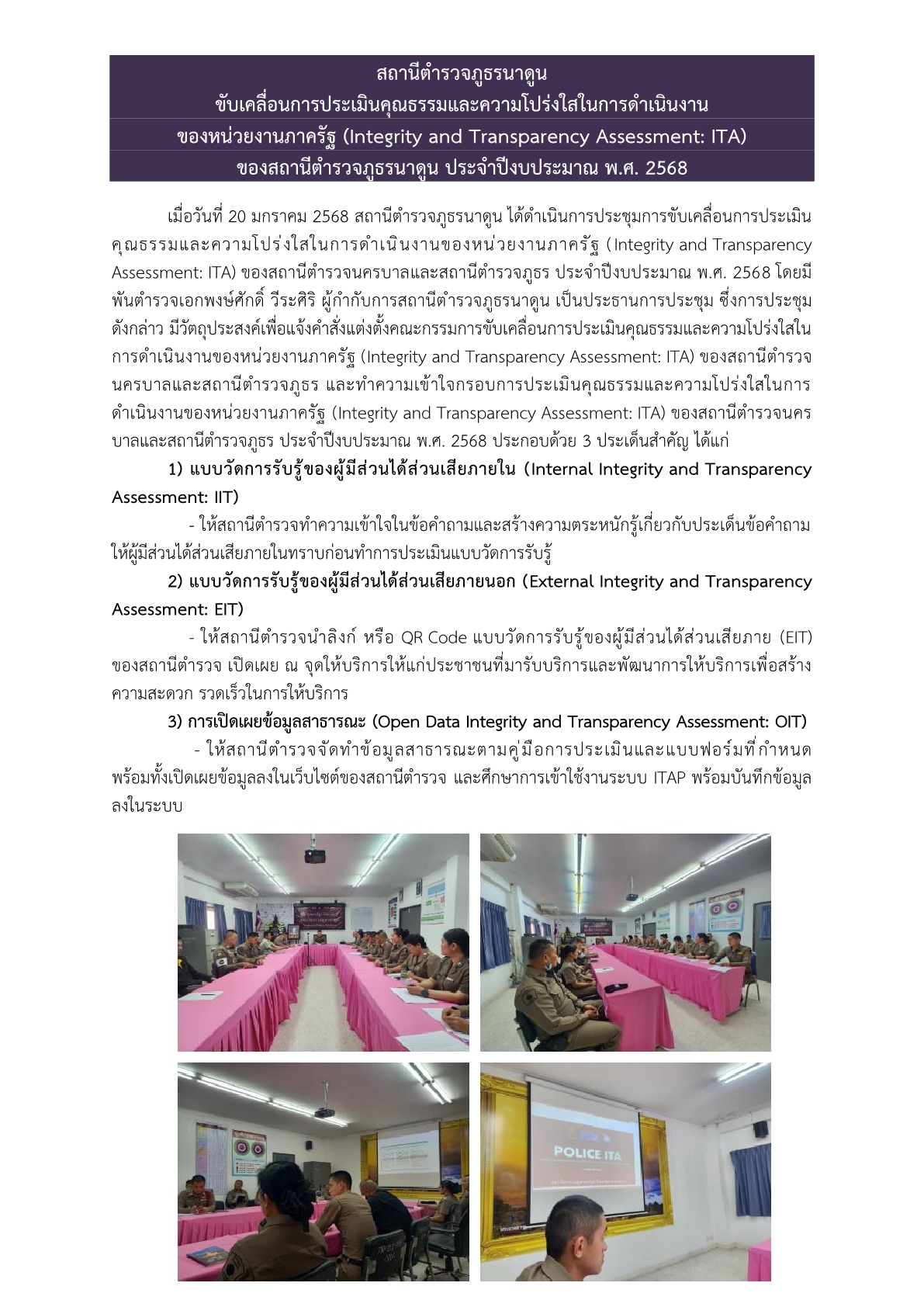 เมื่อวันที่ 20 มกราคม 2568 พ.ต.อ.พงษ์ศักดิ์ วีระศิริ ผกก.สภ.นาดูน ประชุมข้าราชการตำรวจ เพื่อชี้แจงเกี่ยวกับการประเมินคุณธรรมและความโปร่งใสในการดำเนินงานของหน่วยงานภาครัฐ(Integrity & Transparency Assessment: ITA) ของสถานีตำรวจนครบาลและสถานีตำรวจภูธร ประจำปีงบประมาณ พ.ศ. 2568 เพื่อสร้างการรับรู้ และความเข้าใจในการดำเนินโครงการ เพื่อเป็นการเตรียมพร้อมให้ข้าราชการตำรวจทั้งสถานี ได้ปฏิบัติงานให้สอดคล้องกับการประเมิน เพื่อสร้างภาพลักษณ์ที่ดีให้แก่องค์กร รวมถึงการสร้างความพึงพอใจให้แก่ประชาชนผู้ใช้บริการทั้งในและนอกสถานี โดยให้ปฏิบัติหน้าที่อย่างเข้มแข็งและโปร่งใส ไม่เรียกรับสินบนจากการปฏิบัติหน้าที่
