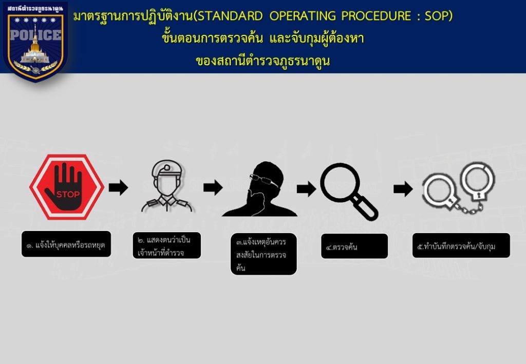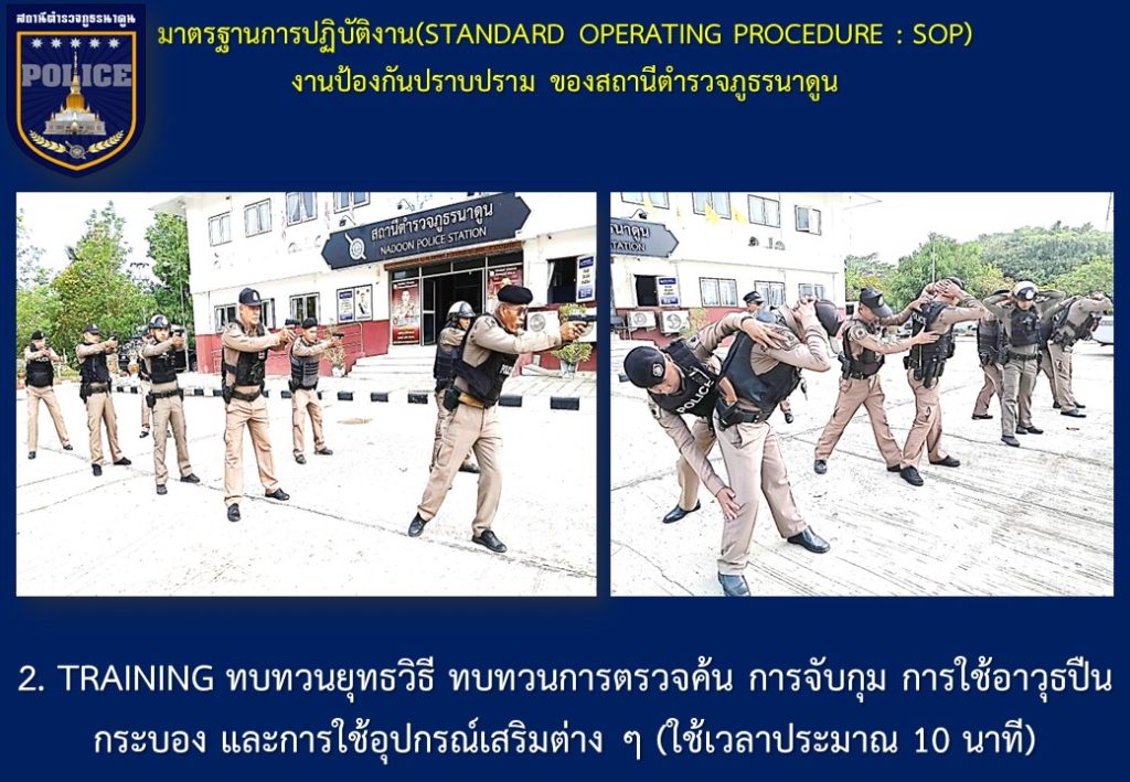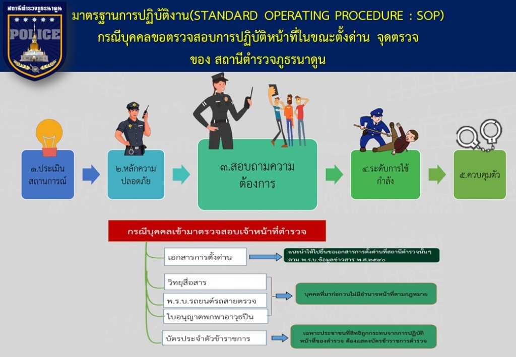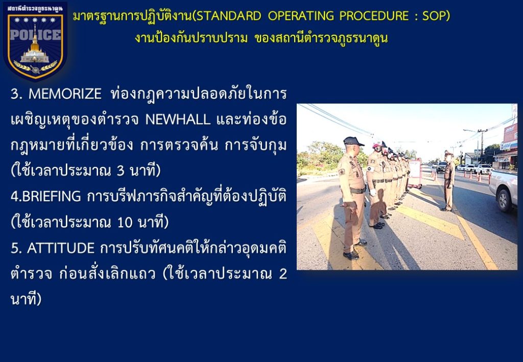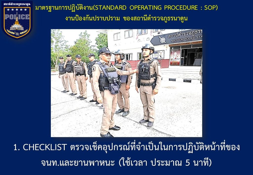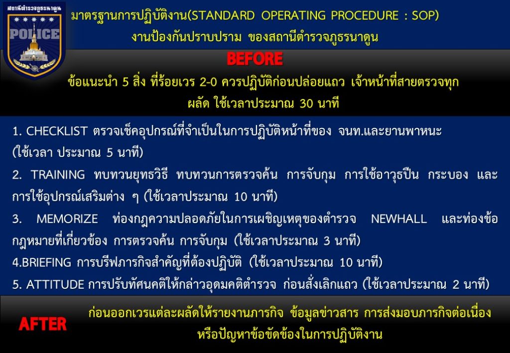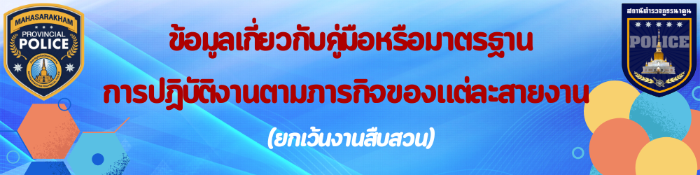 ข้อมูลเกี่ยวกับคู่มือหรือมาตรฐานการปฏิบัติงาน ตามภารกิจของแต่ละงาน (งานอำนวยการ งานป้องกันปราบปราม งานจราจร งานสืบสวน ) พร้อมรายละเอียด