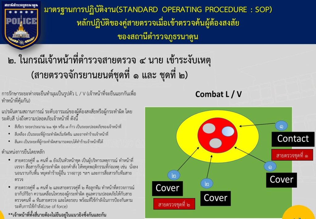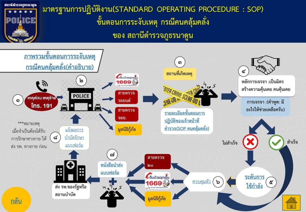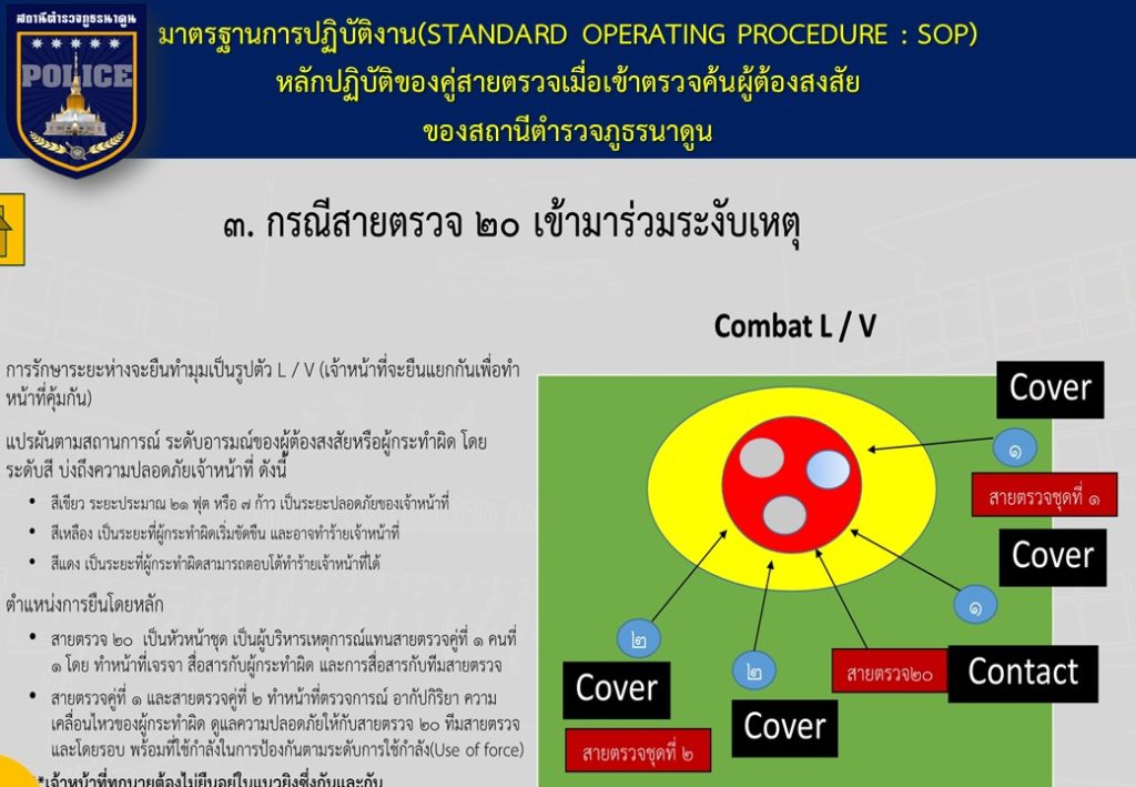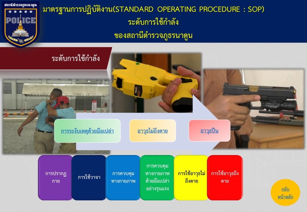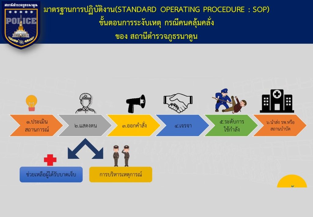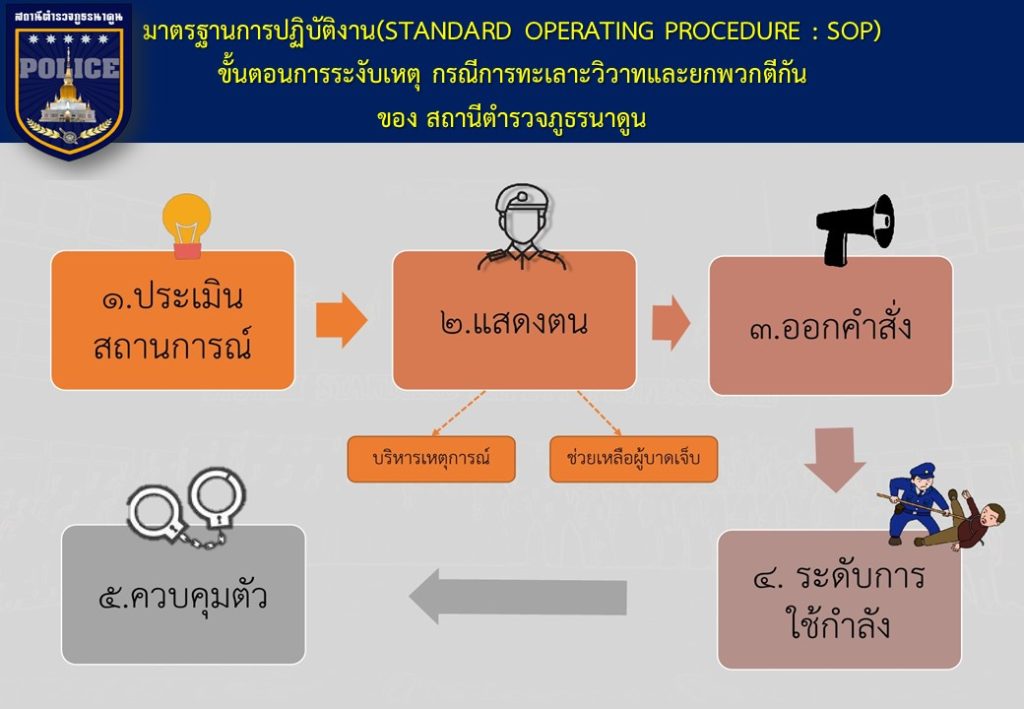 ข้อมูลเกี่ยวกับคู่มือหรือมาตรฐานการปฏิบัติงาน ตามภารกิจของแต่ละงาน (งานอำนวยการ งานป้องกันปราบปราม งานจราจร งานสืบสวน ) พร้อมรายละเอียด